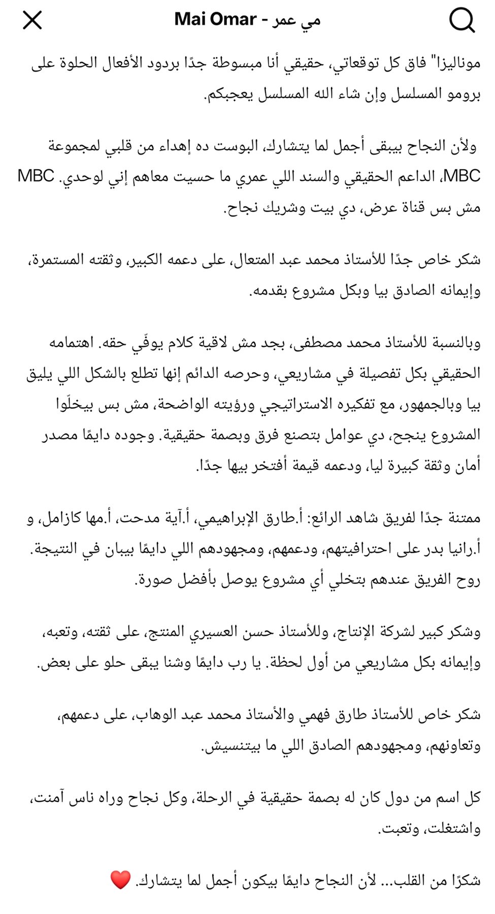 وتابعت: “شكر خاص جدًا للأستاذ محمد عبد المتعال، على دعمه الكبير، وثقته المستمرة، وإيمانه الصادق بيا وبكل مشروع بقدمه”.