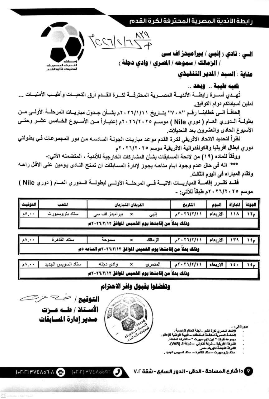 أعلنت رابطة الأندية المصرية المحترفة، اليوم، تعديل موعد مواجهة الزمالك وسموحة في بطولة الدوري الممتاز، لتقام يوم 11 فبراير بدلًا من 12 فبراير.