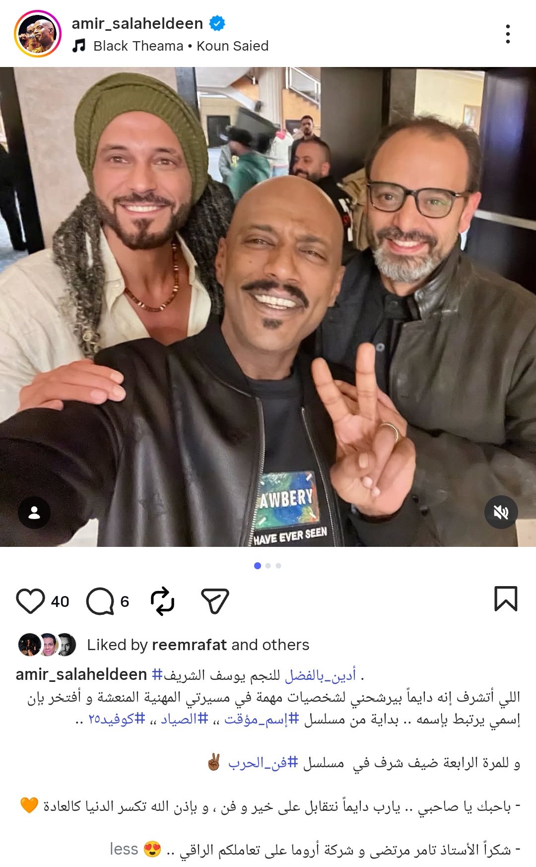 ونشر صورا تجمعهما، وذلك من خلال حسابه الرسمي عبر موقع تبادل الصور والفيديوهات القصيرة إنستجرام، وعلق: أدين بالفضل للنجم يوسف الشريف اللي أتشرف إنه دائماً بيرشحني لشخصيات مهمة في مسيرتي المهنية المنعشة و أفتخر بإن إسمي يرتبط باسمه .. بداية من مسلسل اسم مؤقت ، الصياد ، كوفيد ٢٥، و للمرة الرابعة ضيف شرف في مسلسل فن الحرب.