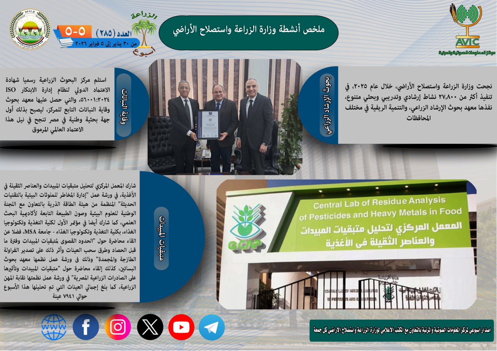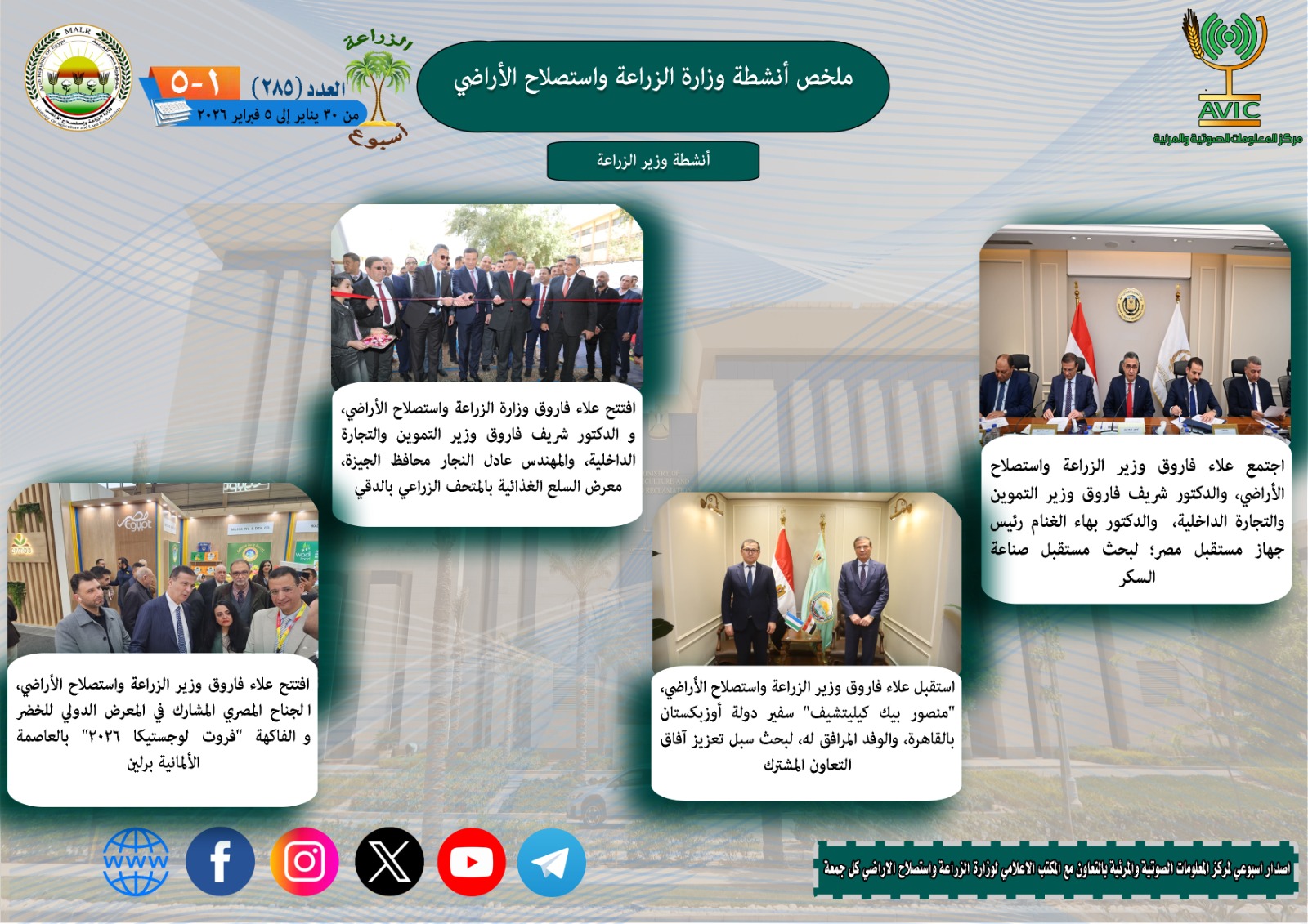 أصدر مركز المعلومات الصوتية والمرئية بوزارة الزراعة واستصلاح الأراضي، "الانفوجراف الاسبوعي" في نسخته رقم 285 حول الحصاد الاسبوعي لأهم أنشطة الوزارة، خلال الاسبوع الماضي في الفترة من 30 يناير وحتى 5 فبراير الجاري، كما أصدر المركز ايضا ملخصا بالفيديو، حول انشطة الوزارة خلال نفس الفترة.