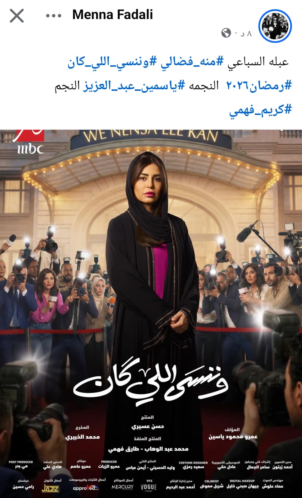 وعلقت قائلة: “عبلة السباعي منة فضالي وننسي اللي كان رمضان 2026، النجمة ياسمين عبد العزيز النجم كريم فهمي”.