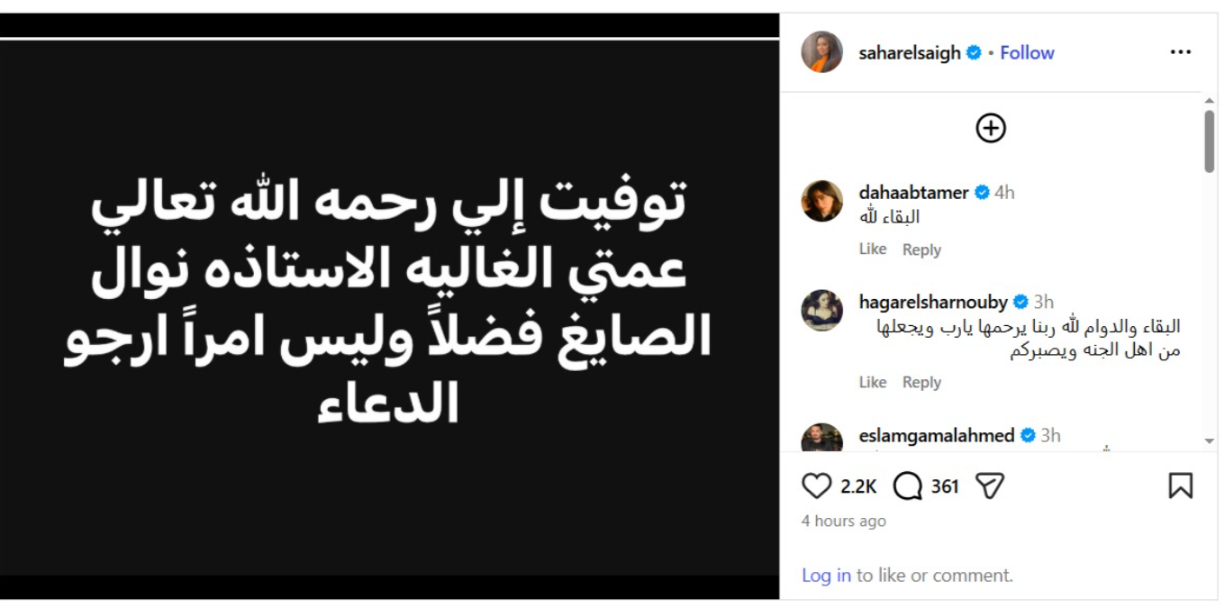 وكتبت سهر الصايغ، قائلة ":توفيت إلي رحمه الله تعالي عمتي الغاليه نوال الصايغ، فضلاً وليس امراً ارجو الدعاء".