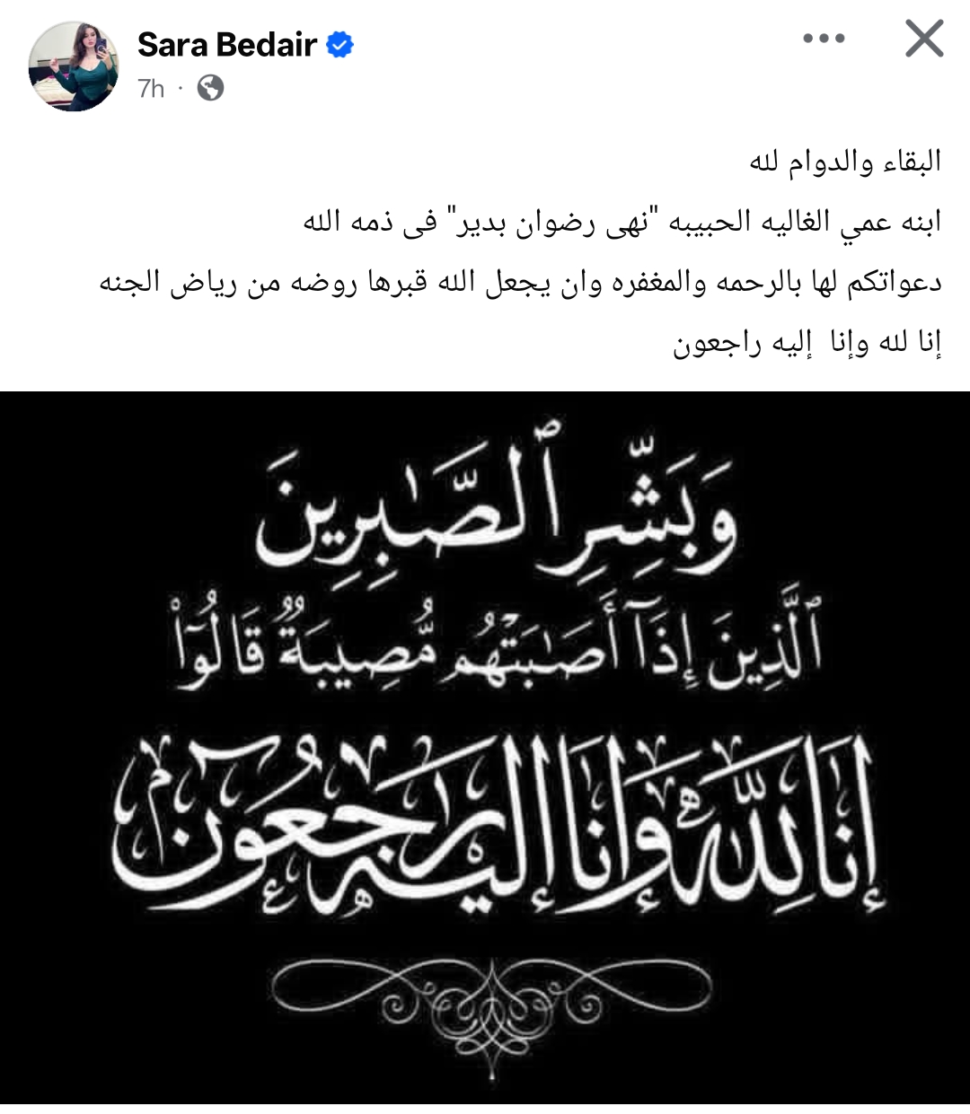 وكتبت سارة بدبر من خلال حسابها الرسمي عبر موقع التواصل الاجتماعي فيسبوك، قالت: البقاء والدوام لله.. ابنه عمي الغاليه الحبيبه "نهى رضوان بدير" فى ذمه الله.