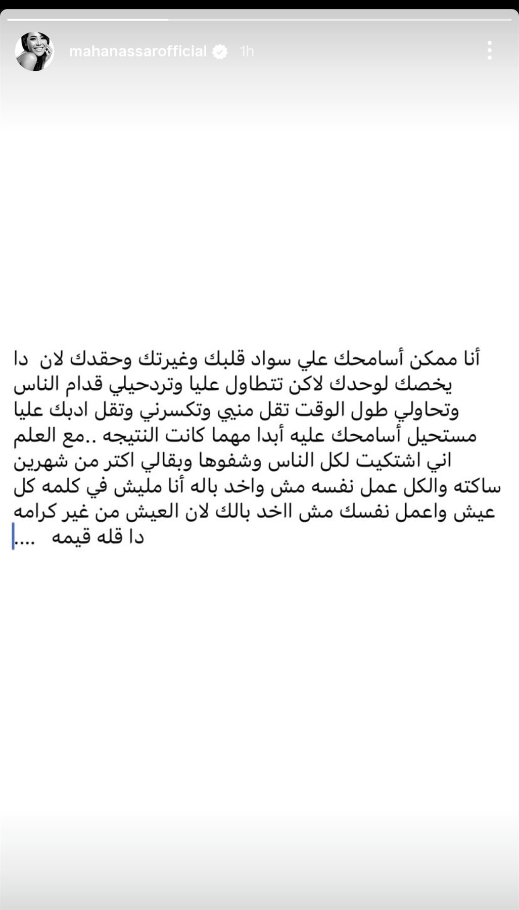 وكشفت مها نصار تفاصيل الخلاف، وكتبت من خلال حسابها الرسمي عبر موقع تبادل الصور والفيديوهات القصيرة إنستجرام، عبر خاصية ستوري: “أنا ممكن أسامحك على سواد قلبك وغيرتك وحقدك لان دا يخصك لوحدك لاكن تتطاول عليا وترد حيلي قدام الناس وتحاولي طول الوقت تقل مني وتكسرني وتقل ادبك عليا مستحيل أسامحك عليه أبدا مهما كانت النتيجه».