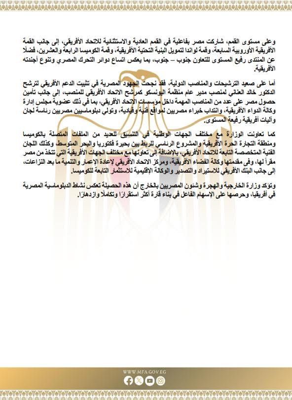 وتؤكد وزارة الخارجية والهجرة وشئون المصريين بالخارج أن هذه الحصيلة تعكس نشاط الدبلوماسية المصرية في أفريقيا، وحرصها على الإسهام الفاعل في بناء قارة أكثر استقرارا وتكاملا وازدهارا.