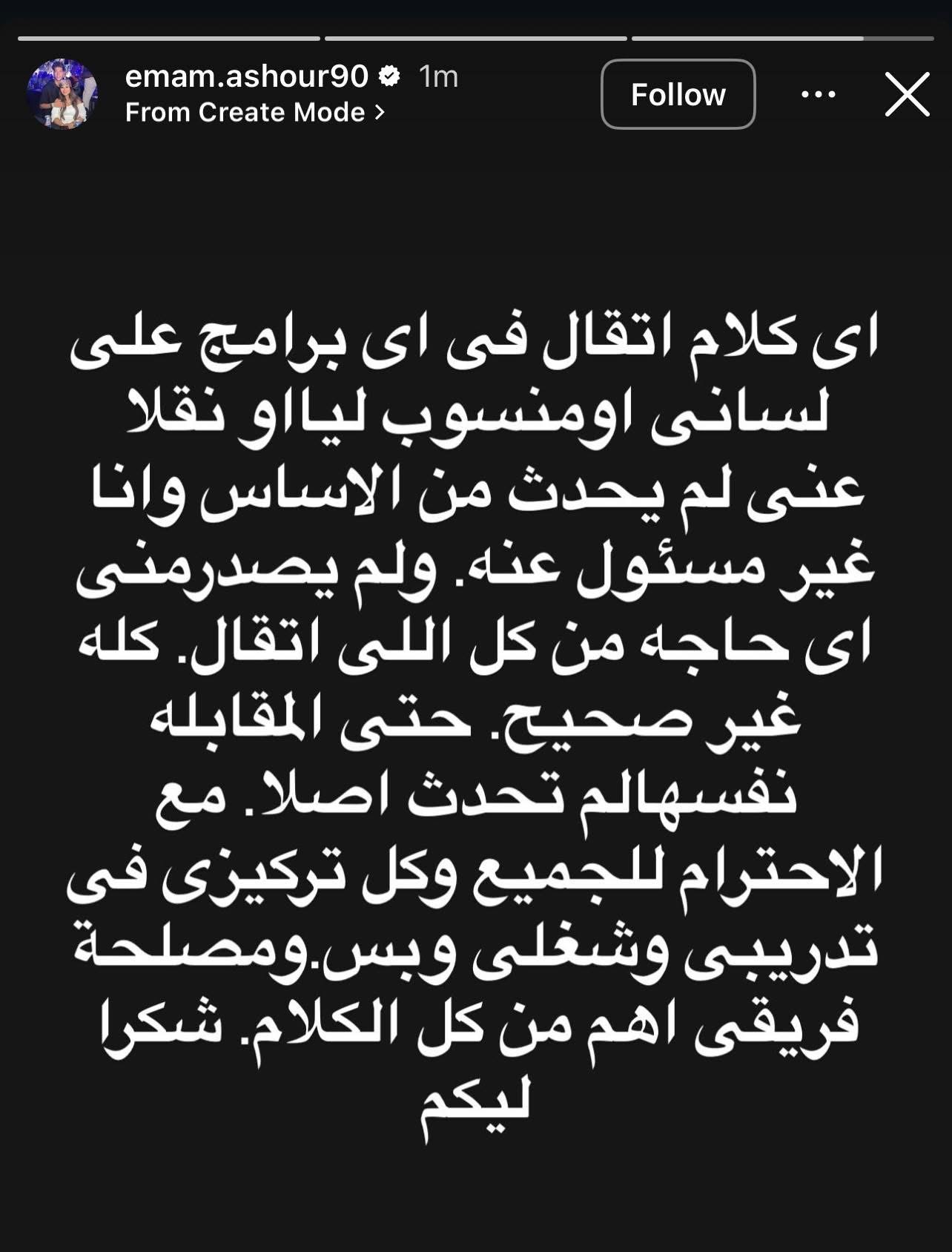 لكن رد عاشور جاء سريعًا وحاسمًا عبر صفحته على إنستجرام، حيث كتب:"أي كلام اتقال في أي برامج عليا لساني أو منسوب ليا لم يحدث من الأساس وأنا غير مسؤول عنه، ولم يصدر مني أي حاجة من كل الكلام اللي اتقال."