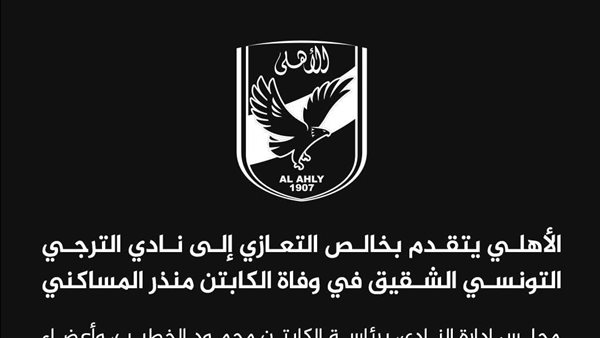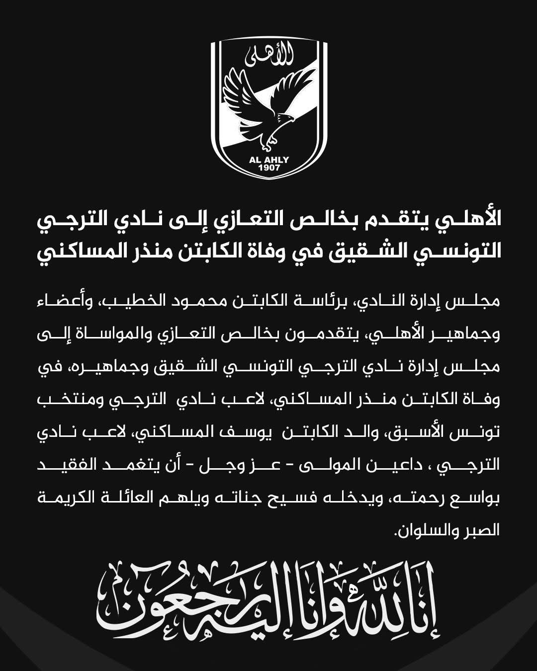 تقدم مجلس إدارة النادي الأهلي، برئاسة الكابتن محمود الخطيب، بخالص التعازي والمواساة إلى مجلس إدارة نادي الترجي التونسي وجماهيره، في وفاة الكابتن منذر المساكني، لاعب الترجي ومنتخب تونس الأسبق، ووالد الكابتن يوسف المساكني لاعب الفريق.
