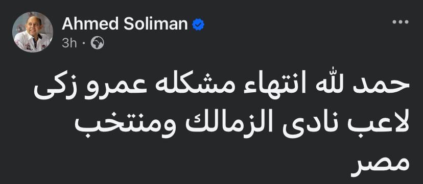 وأكد سليمان، عبر حسابه الرسمي على موقع التواصل الاجتماعي «فيسبوك»، أن الأزمة انتهت تمامًا، حيث كتب: "الحمد لله انتهاء مشكلة عمرو زكي لاعب نادي الزمالك ومنتخب مصر".