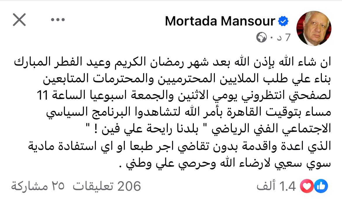 وكتب مرتضى منصور عبر حسابه الشخصي على موقع «فيس بوك»: «إن شاء الله بإذن الله بعد شهر رمضان الكريم وعيد الفطر المبارك بناء على طلب الملايين المحترمين والمحترمات المتابعين لصفحتي انتظروني يومي الاثنين والجمعة أسبوعيًا الساعة 11 مساء بتوقيت القاهرة بأمر الله لتشاهدوا البرنامج السياسي الاجتماعي الفني الرياضي بلدنا رايحة على فين».