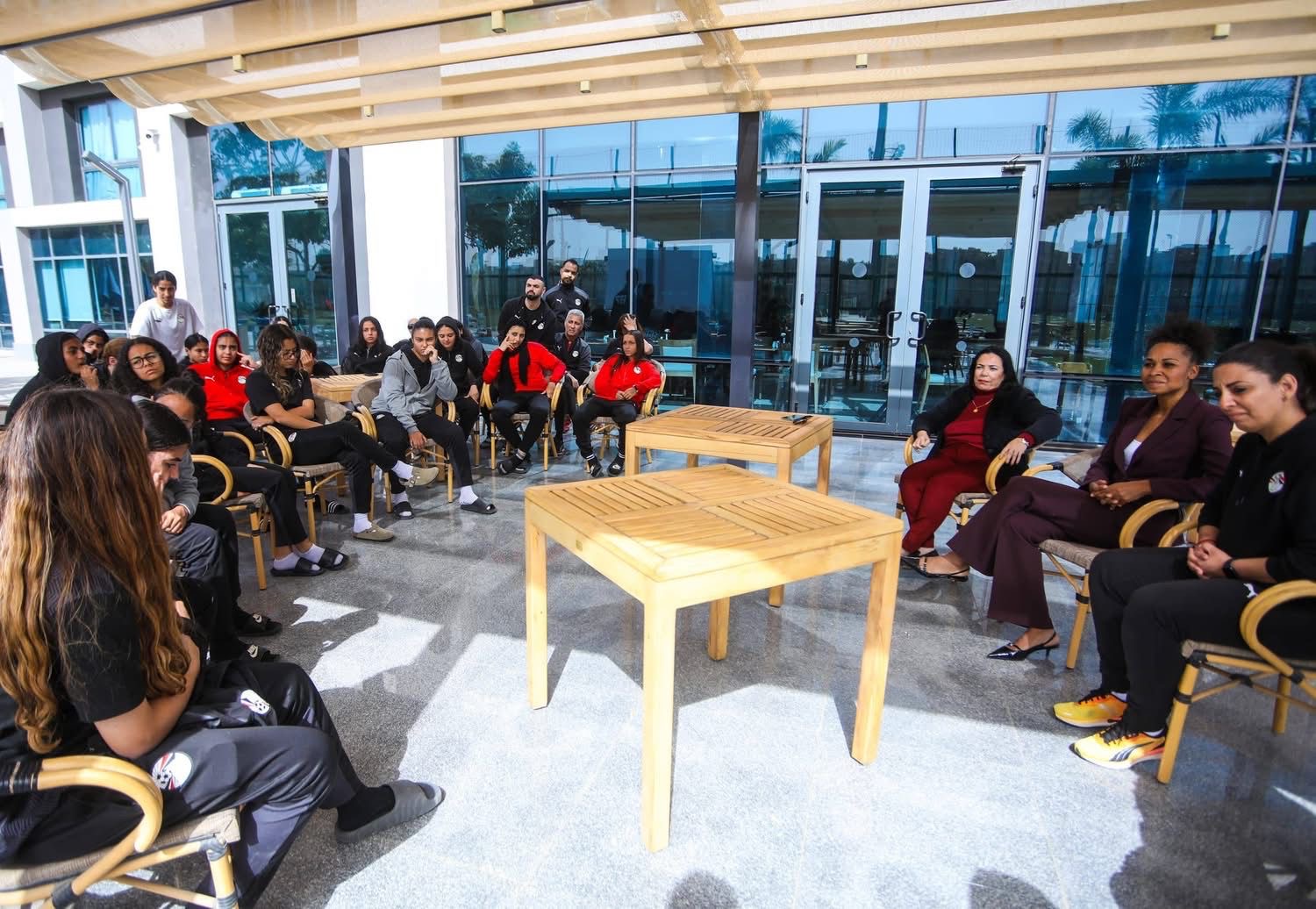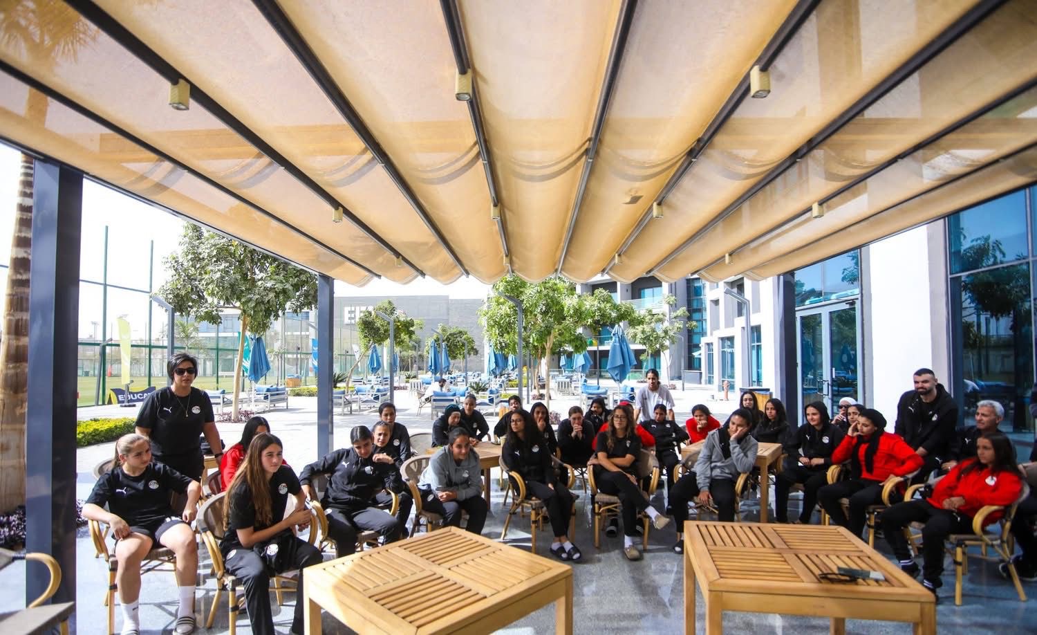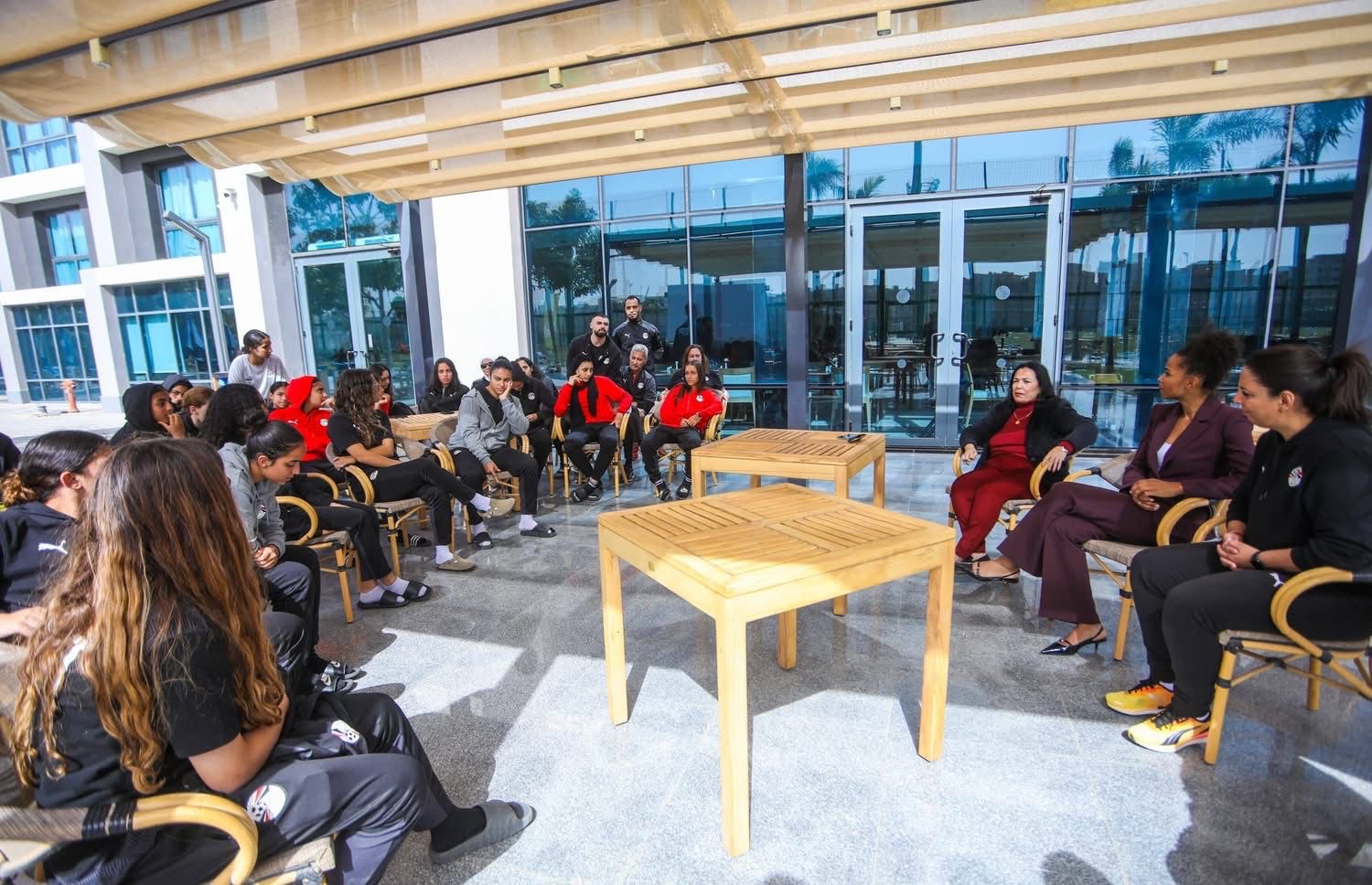 لورا جورج تزور مقر اتحاد الكرة وتجتمع بلاعبات المنتخب