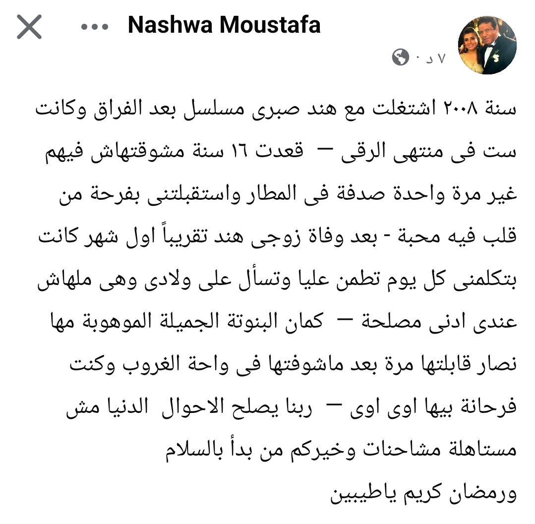 وأضافت: “بعد وفاة زوجى هند تقريبًا أول شهر كانت بتكلمنى كل يوم تطمن عليا وتسأل على ولادي وهى ملهاش عندى أدنى مصلحة — كمان البنوتة الجميلة الموهوبة مها نصار قابلتها مرة بعد ماشوفتها فى واحة الغروب وكنت فرحانة بيها اوى اوى — ربنا يصلح الأحوال، الدنيا مش مستاهلة مشاحنات وخيركم من بدأ بالسلام، ورمضان كريم يا طيبين”.