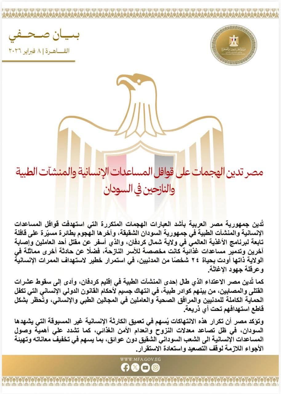وأكدت مصر أن تكرار هذه الانتهاكات يُسهم في تعميق الكارثة الإنسانية غير المسبوقة التي يشهدها السودان، في ظل تصاعد معدلات النزوح وانعدام الأمن الغذائي، كما تشدد علي أهمية وصول المساعدات الإنسانية الى الشعب السوداني الشقيق دون عوائق، بما يسهم في تخفيف معاناته وتهيئة الأجواء اللازمة لوقف التصعيد واستعادة الاستقرار.