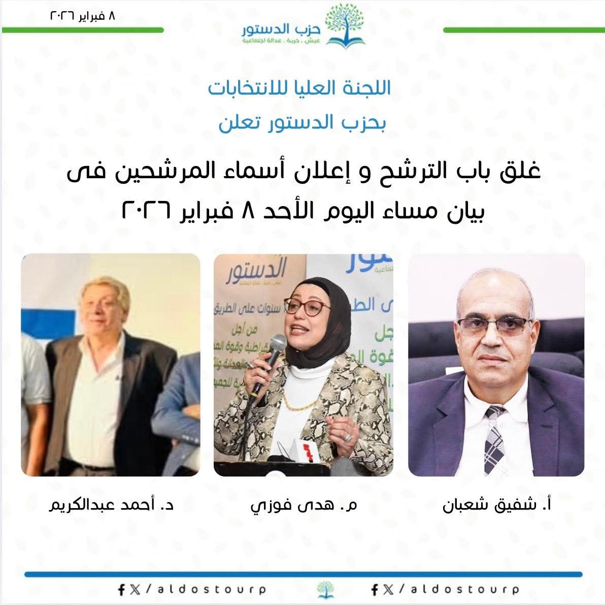 أعلنت اللجنة العليا لانتخابات حزب الدستور، برئاسة شفيق شعبان وعضوية هدى فوزي وأحمد عبد الكريم، غلق باب الترشح لانتخابات الحزب المقرر عقدها في 22 مارس المقبل.