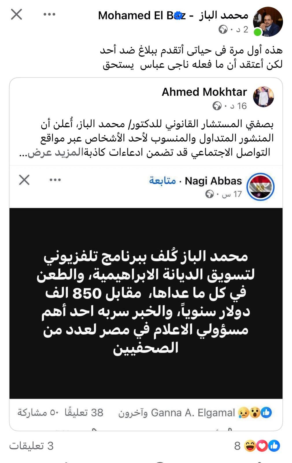 وتضمن المنشور الذي كتبه المدعو ناجي عباس عبر صفحته الرسمية بموقع فيسبوك التالي: “محمد الباز كلف ببرنامج تلفزيوني لتسويق الديانة الإبراهيمية، والطعن في كل ما عداها، مقابل 850 الف دولار سنوياً، والخبر سربه احد أهم مسؤولي الاعلام في مصر لعدد من الصحفيين”.