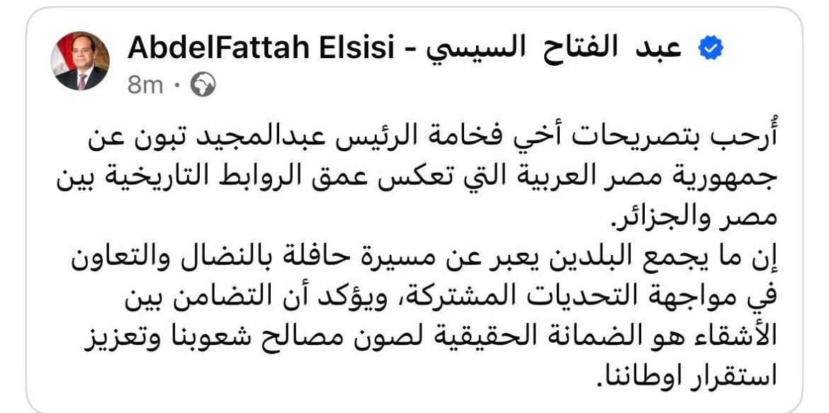 وكتب الرئيس السيسي عبر صفحاته الرسمية على مواقع التواصل الاجتماعي: أُرحب بتصريحات أخي فخامة الرئيس عبدالمجيد تبون عن جمهورية مصر العربية التي تعكس عمق الروابط التاريخية بين مصر والجزائر.