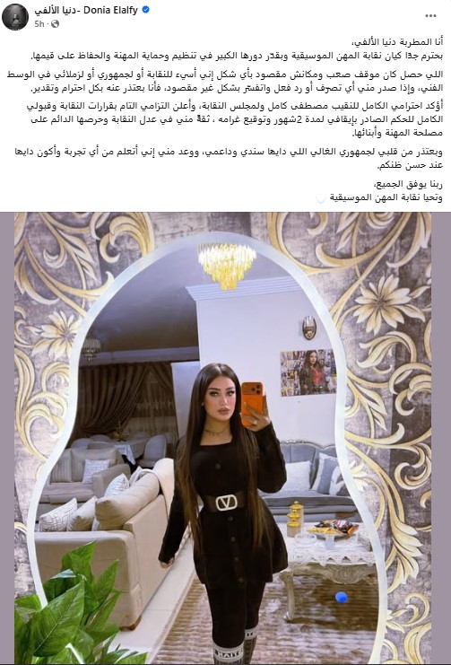 وكتبت دنيا الألفي من خلال حسابها الرسمي عبر موقع التواصل الاجتماعي فيسبوك: أنا المطربة دنيا الألفي، بحترم جدًا كيان نقابة المهن الموسيقية وبقدّر دورها الكبير في تنظيم وحماية المهنة والحفاظ على قيمها.