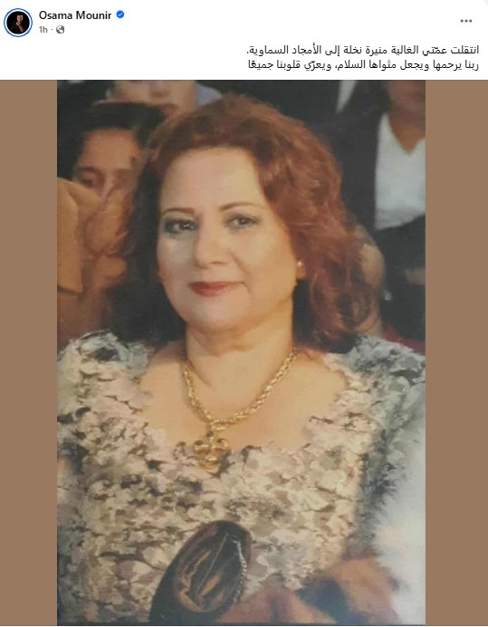 ونشر أسامة منير صورة عمته، من خلال حسابه الرسمي عبر موقع التواصل الاجتماعي فيسبوك، وعلق: انتقلت عمّتي الغالية منيرة نخلة إلى الأمجاد السماوية.. ربنا يرحمها ويجعل مثواها السلام، ويعزّي قلوبنا جميعًا.
