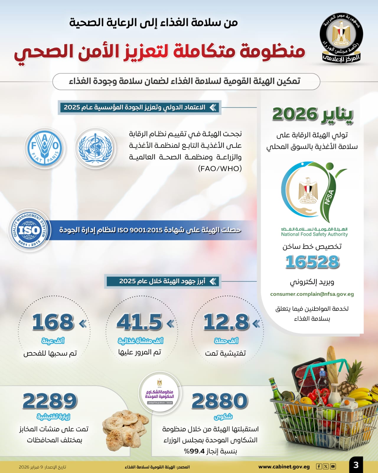 وفيما يتعلق بالرقابة على الأغذية، تم تمكين الهيئة القومية لسلامة الغذاء من تولي مسؤولية الرقابة على سلامة الأغذية بالسوق المحلي لضمان سلامة وجودة الغذاء، اعتبارًا من يناير 2026، مع تخصيص الخط الساخن 16528، ورقم "واتس آب" 01555771100، والبريد الإلكتروني [email protected] لاستقبال الشكاوى وخدمة المواطنين فيما يتعلق بسلامة الغذاء.