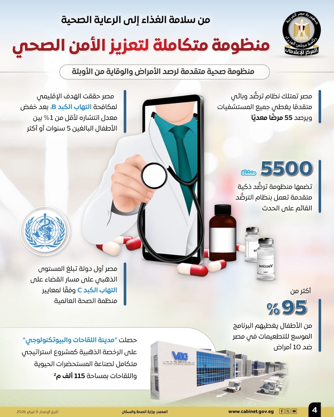 وتعكس هذه المنظومة توجه الدولة نحو تعزيز الأمن الصحي من منظور شامل، يقوم على الوقاية باعتبارها الأساس، من خلال ضمان سلامة الغذاء، إلى جانب تطوير منظومة الرعاية الصحية، بما يحقق حماية صحة المواطنين، ويدعم استدامة الخدمات الصحية، ويُسهم في تحسين جودة الحياة.