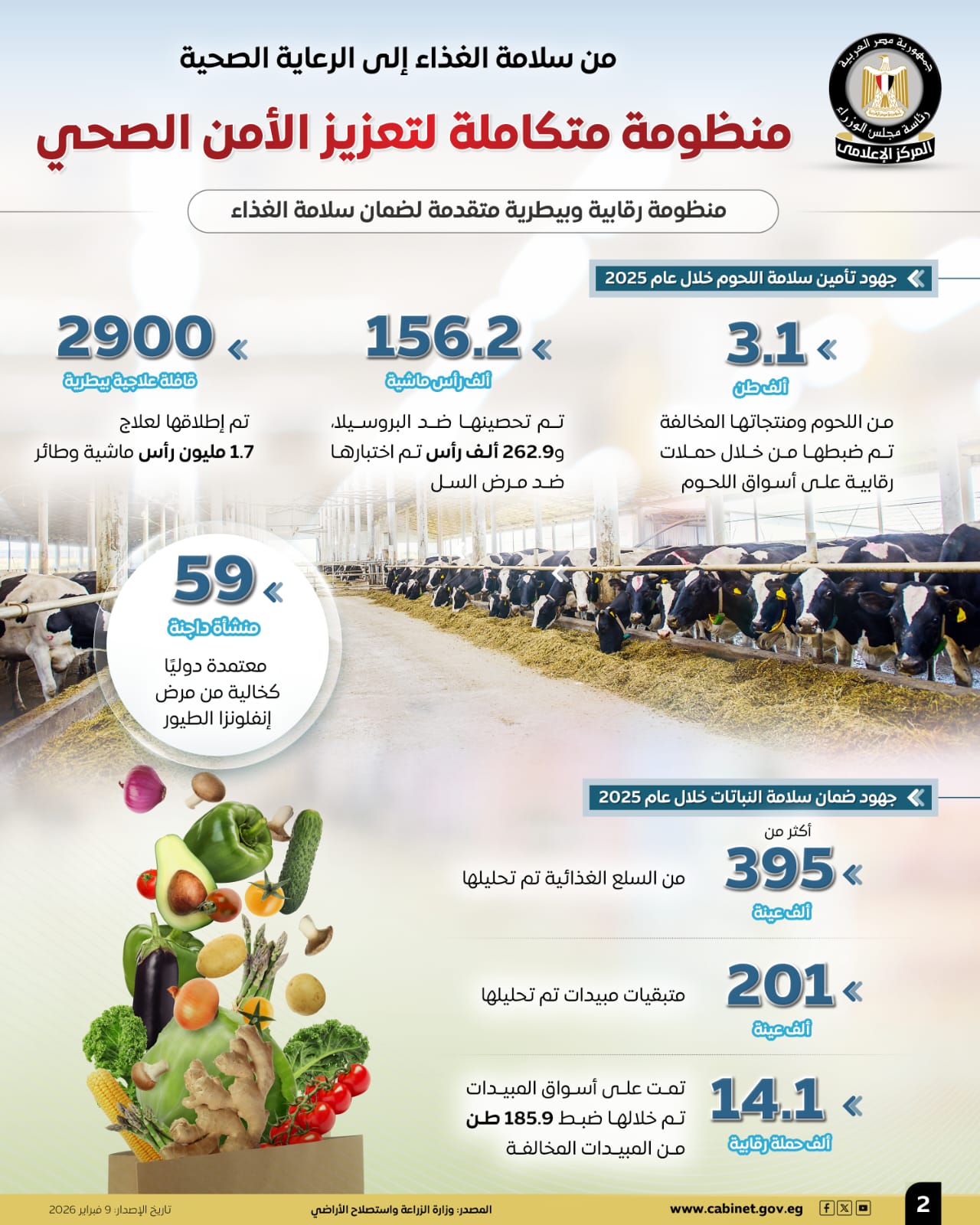 وفيما يتعلق بالمنظومة الرقابية والبيطرية المتقدمة لضمان سلامة الغذاء، أشارت الإنفوجرافات إلى جهود تأمين سلامة اللحوم خلال عام 2025، حيث تم ضبط 3.1 ألف طن من اللحوم ومنتجاتها المخالفة من خلال حملات رقابية على أسواق اللحوم، وكذلك تحصين 156.2 ألف رأس ماشية ضد البروسيلا، إلى جانب اختبار 262.9 ألف رأس ضد مرض السل.