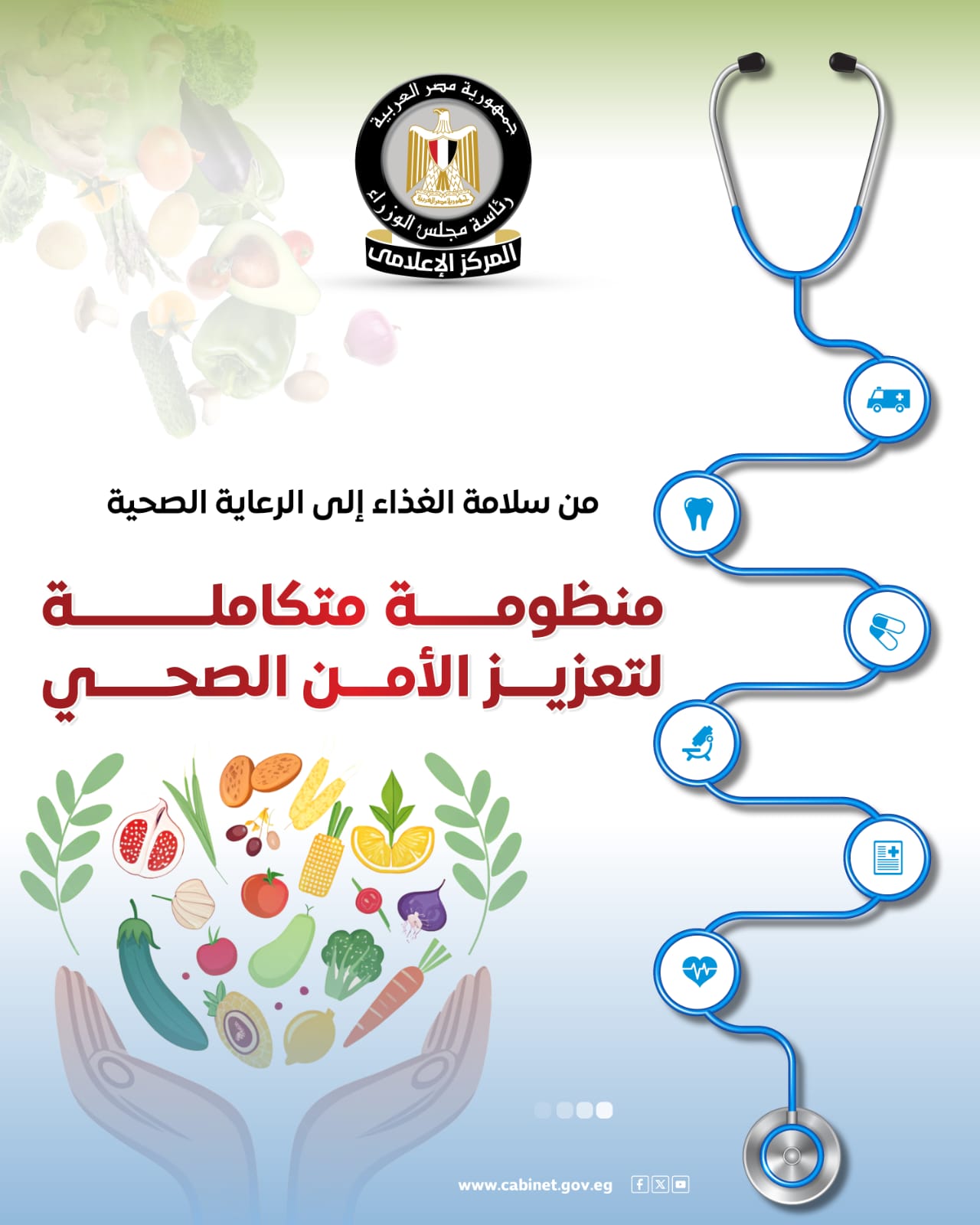 نشر المركز الإعلامي لمجلس الوزراء عددًا من الإنفوجرافات عبر منصاته على مواقع التواصل الاجتماعي، استعرض من خلالها المنظومة المتكاملة لتعزيز الأمن الصحي بدءًا من ضمان سلامة الغذاء وصولًا إلى الرعاية الصحية.