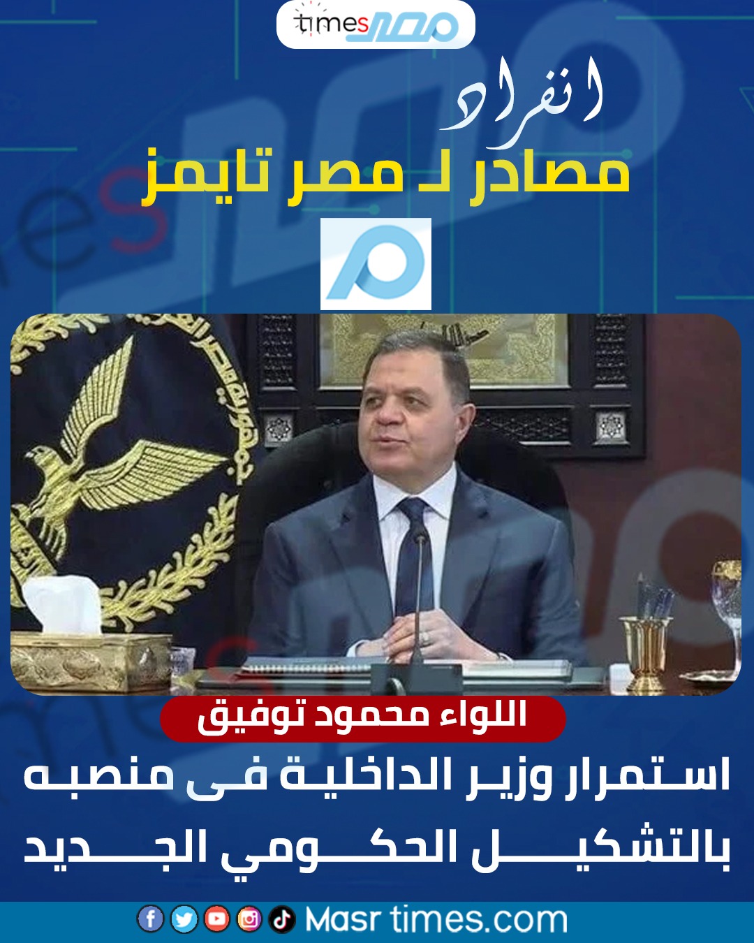 كشفت مصادر مطلعة لـ«مصر تايمز»، عن استمرار اللواء محمود توفيق وزير الداخلية، فى منصبه بالتشكيل الحكومي الجديد.
