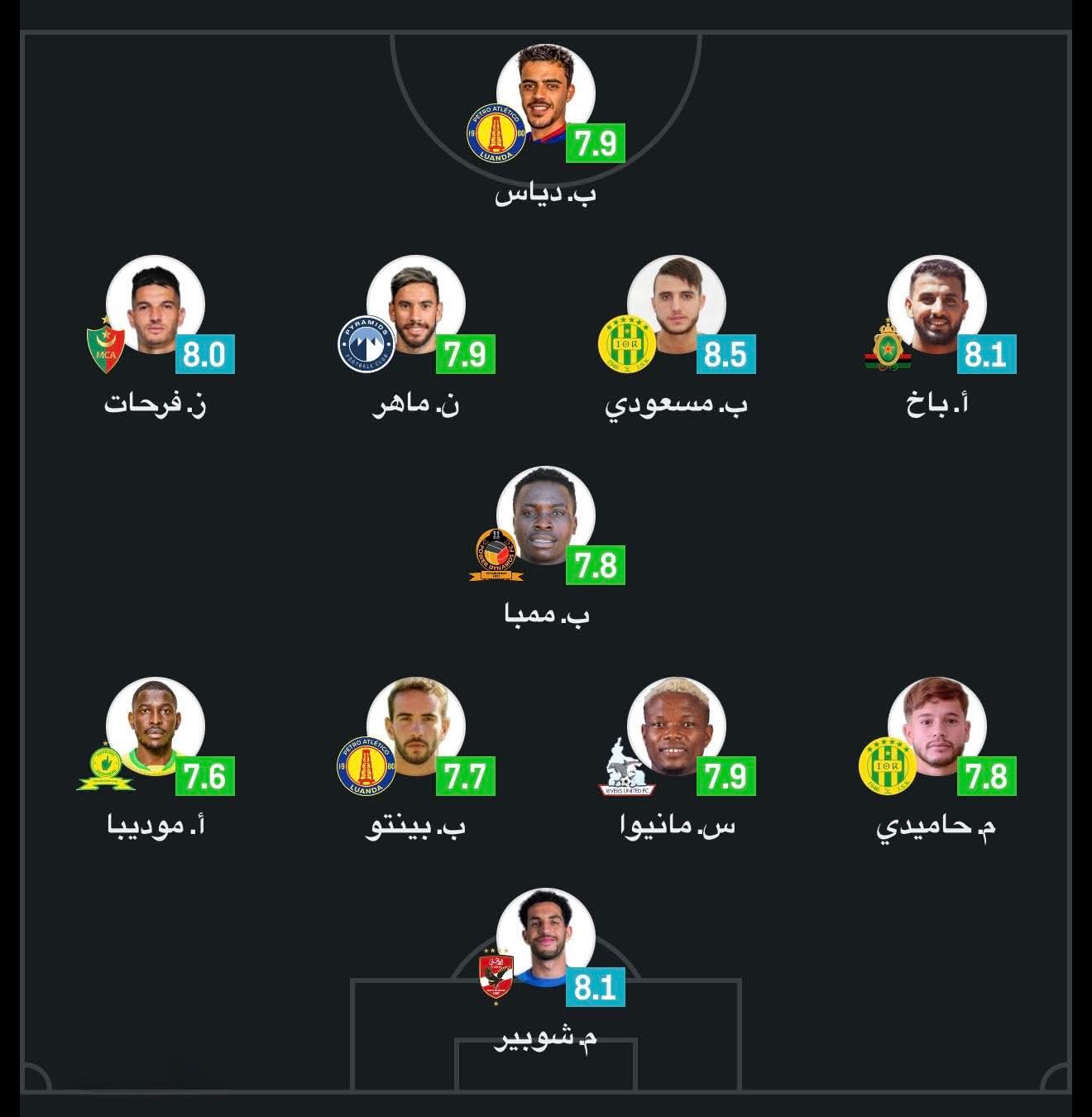 خط الوسط: برينس ممبا (باور ديناموز)، زين الدين فرحات (مولودية الجزائر)، ناصر ماهر (بيراميدز)، بلال مسعودي (شبيبة القبائل)، أنس باخ (الجيش الملكي).