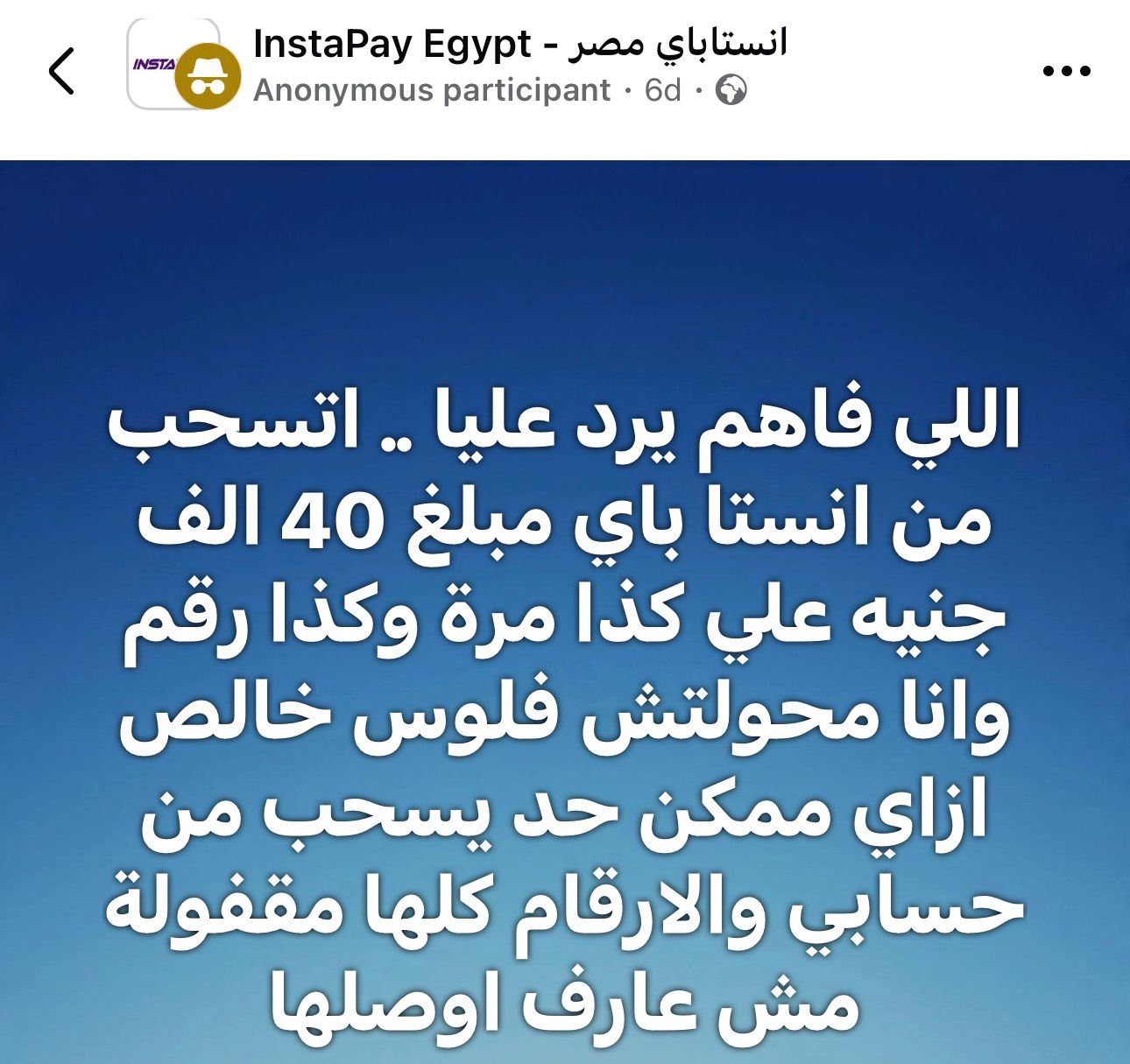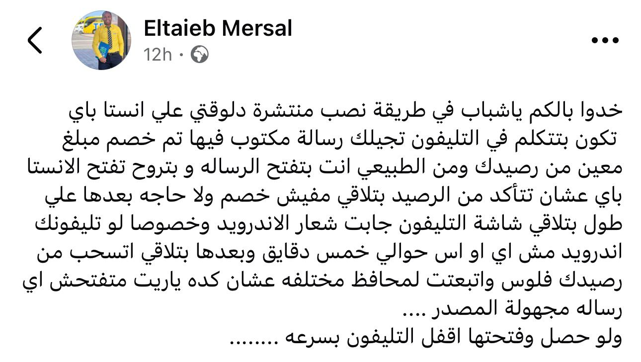 وقال أحد رواد مواقع التواصل الاجتماعي: خدوا بالكم ياشباب في طريقة نصب منتشرة دلوقتي علي انستا باي تكون بتتكلم في التليفون تجيلك رسالة مكتوب فيها تم خصم مبلغ معين من رصيدك ومن الطبيعي انت بتفتح الرساله و بتروح تفتح الانستا باي عشان تتأكد من الرصيد بتلاقي مفيش خصم ولا حاجه بعدها علي طول بتلاقي شاشة التليفون جابت شعار الاندرويد وخصوصا لو تليفونك اندرويد مش اي او اس حوالي خمس دقايق وبعدها بتلاقي اتسحب من رصيدك فلوس واتبعتت لمحافظ مختلفه عشان كده ياريت متفتحش اي رساله مجهولة المصدر .. ولو حصل وفتحتها اقفل التليفون بسرعة
