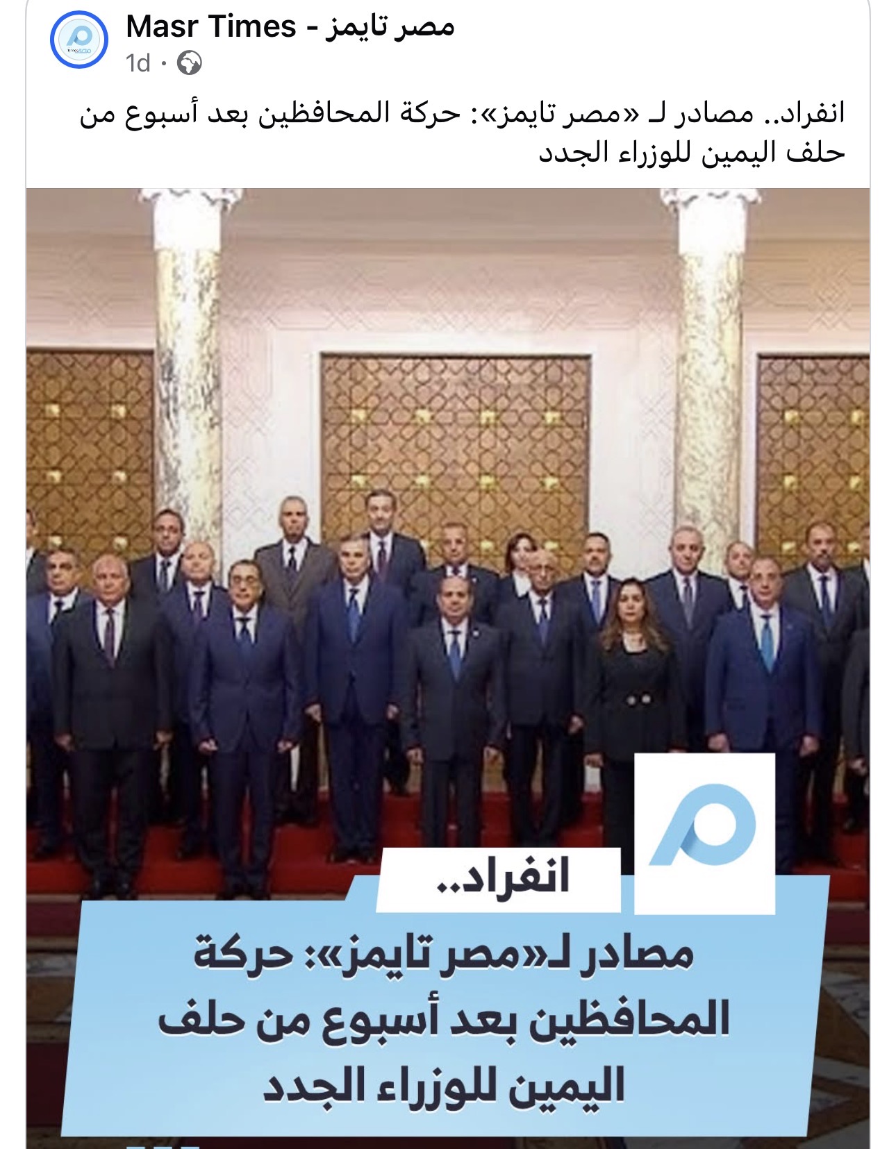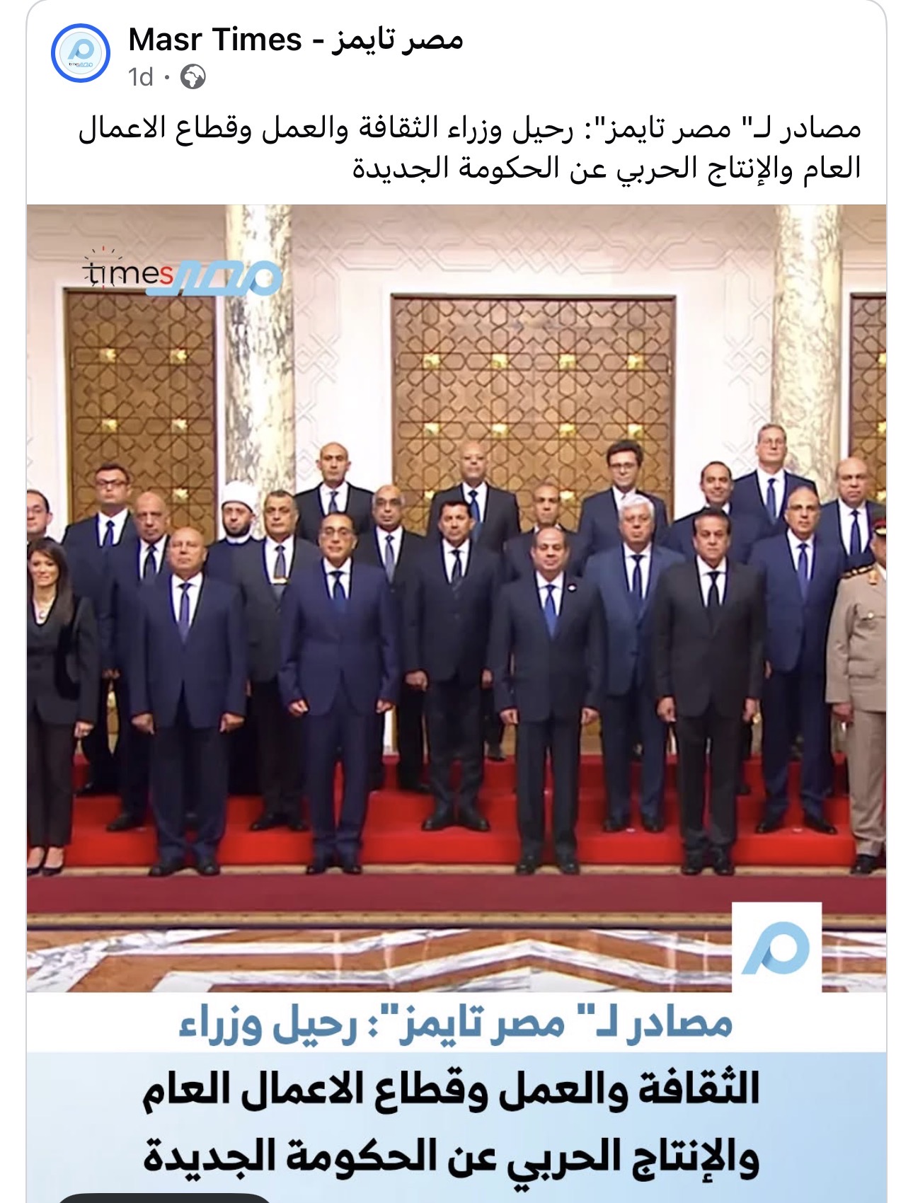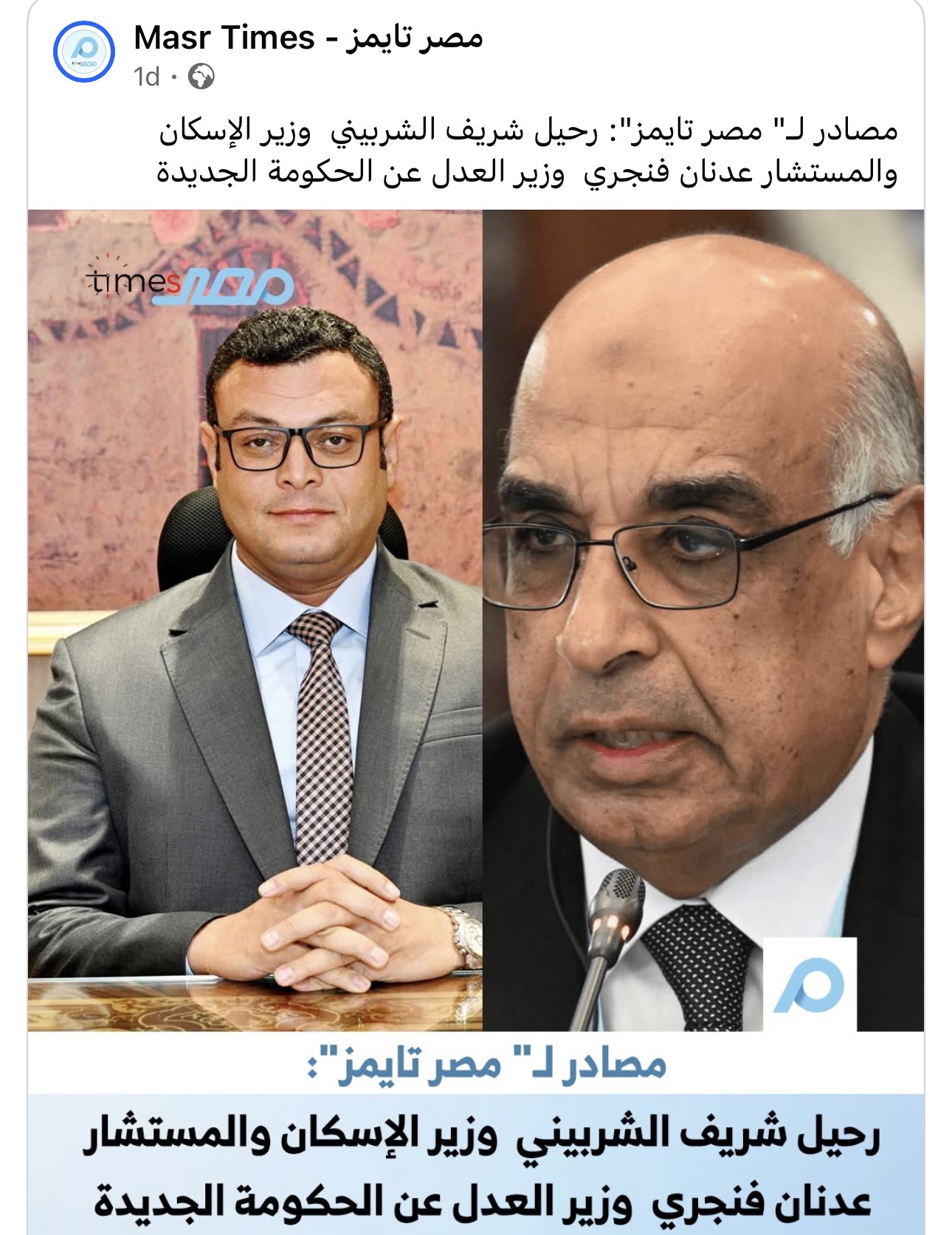 وكانت قد كشفت مصادر لـ" مصر تايمز" عن رحيل كل من المهندس عمرو طلعت، وزير الاتصالات وتكنولوجيا المعلومات، والدكتور أيمن عاشور، وزير التعليم العالي، والدكتورة رانيا المشاط، وزيرة التخطيط والتعاون الدولي، والدكتور أشرف صبحي، وزير الشباب والرياضة، والمهندس شريف الشربيني، وزير الإسكان، والمستشار عدنان فنجري، وزير العدل، والمهندس حسن الخطيب، وزير الاستثمار، والدكتور أحمد هنو، وزير الثقافة، ومحمد جبران، وزير العمل، والمهندس محمد الشيمي، وزير قطاع الاعمال العام، ومحمد صلاح الدين، وزير الإنتاج الحربي، عن الحكومة الجديدة.