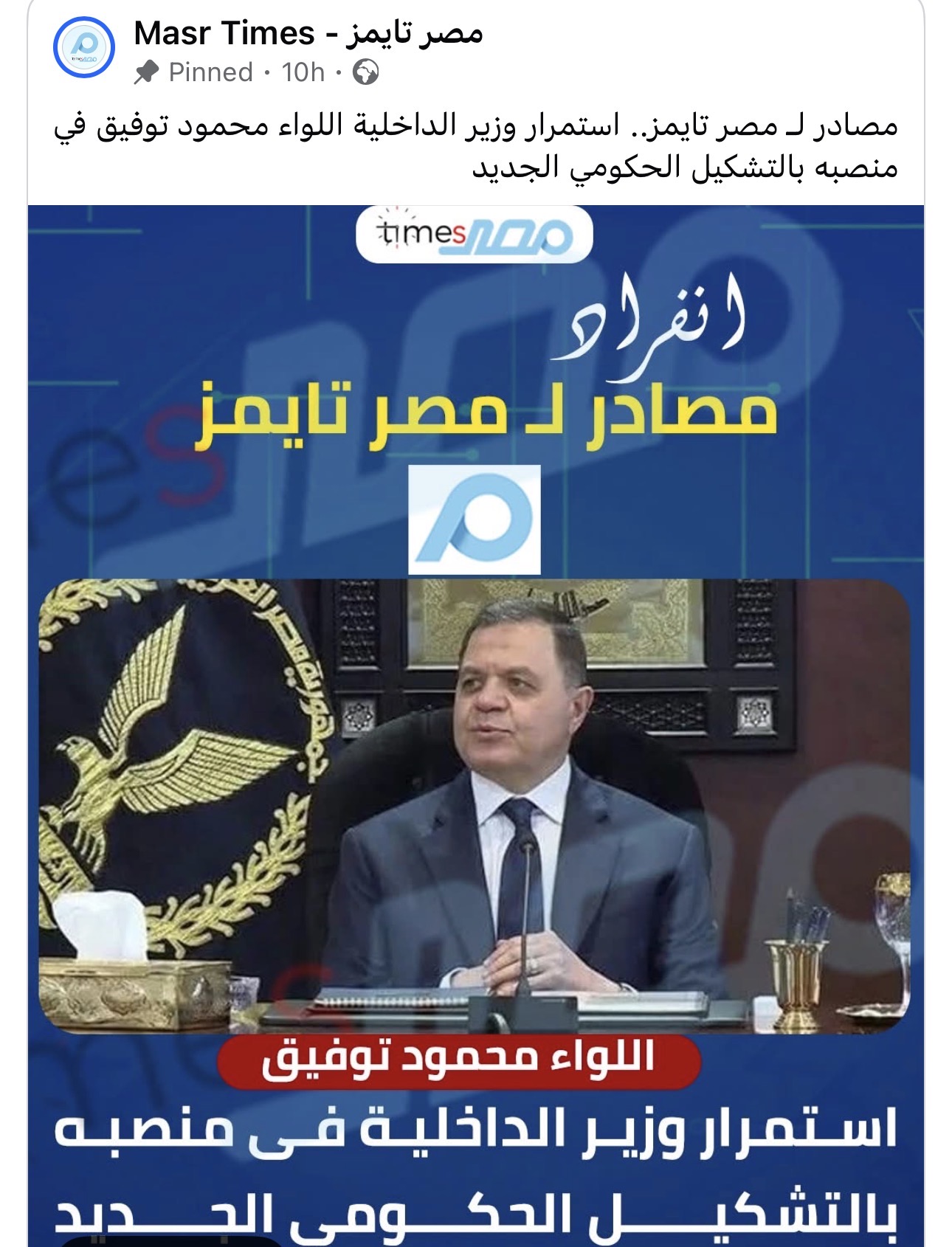 وكانت قد كشفت مصادر مطلعة لـ«مصر تايمز»، عن استمرار محمود توفيق وزير الداخلية، والدكتور خالد عبد الغفار، نائب رئيس مجلس الوزراء لشئون التنمية البشرية ووزير الصحة والسكان، والدكتور سامح الحفني، وزير الطيران المدني، والدكتور محمود عصمت وزير الكهرباء والدكتورة مايا مرسي وزيرة التضامن الاجتماعي، والمستشار محمود فوزي وزير الشئون النيابية والقانونية والتواصل السياسي ومحمد عبد اللطيف وزير التربية والتعليم وأحمد كوجك وزير المالية، والدكتور أسامة الأزهري وزير الأوقاف، والدكتور بدر عبد العاطي وزير الخارجية، والدكتور هاني سويلم، وزير الري، وشريف فتحي وزير السياحة، والمهندس كريم بدوي وزير البترول، وعلاء فاروق وزير الزراعة، فى منصبهم بالتشكيل الحكومي الجديد.