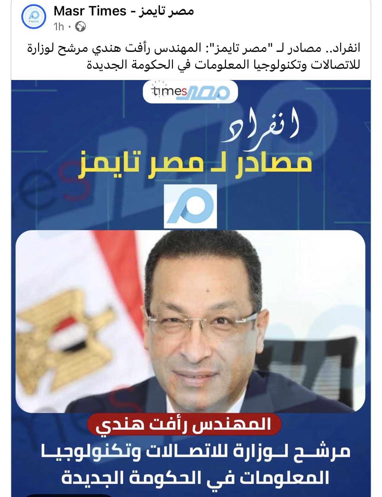وكشفت مصادر مطلعة لـ«مصر تايمز» أن المهندس رأفت هندي ، نائب وزير الاتصالات، هو المرشح الأبرز لتولي منصب وزير الاتصالات خلفا للمهندس عمرو طلعت.