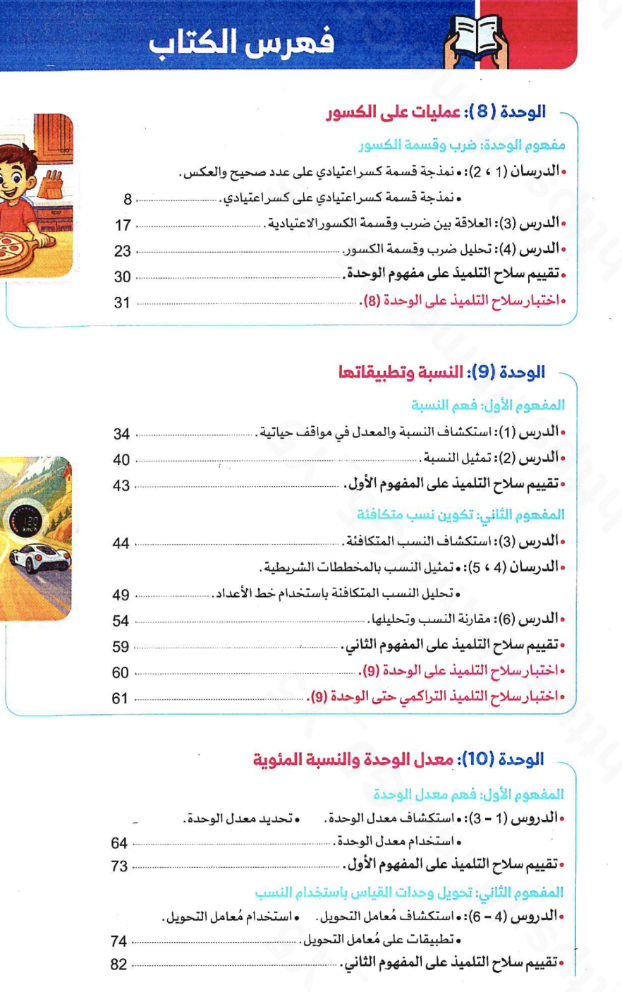 يضم الكتاب في الترم الثاني خمس وحدات أساسية، تبدأ من العمليات على الكسور وتنتهي بحساب مساحات المضلعات، مع اختبارات تراكمية تقيس مستوى الطالب بشكل مستمر.