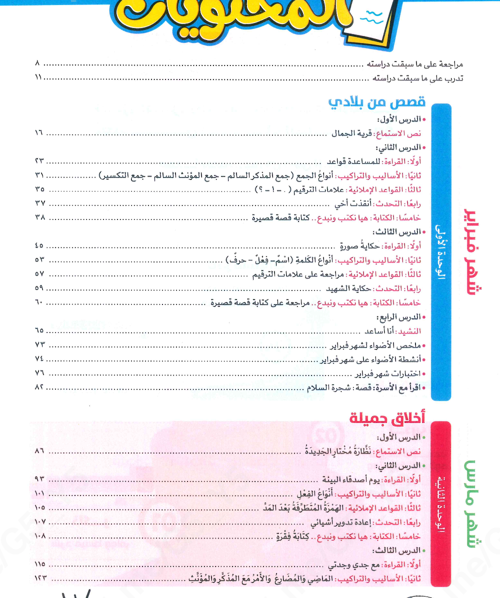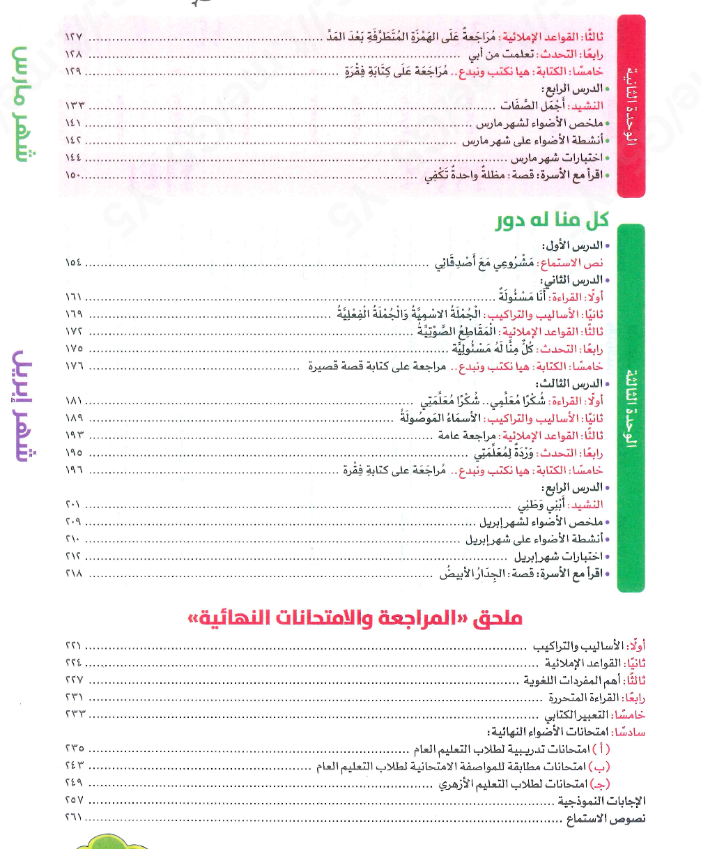 - وتختتم الوحدة بملخص شهر إبريل، وأنشطة، واختبارات، وقصة الجدار الأبيض ضمن فقرة اقرأ مع الأسرة.