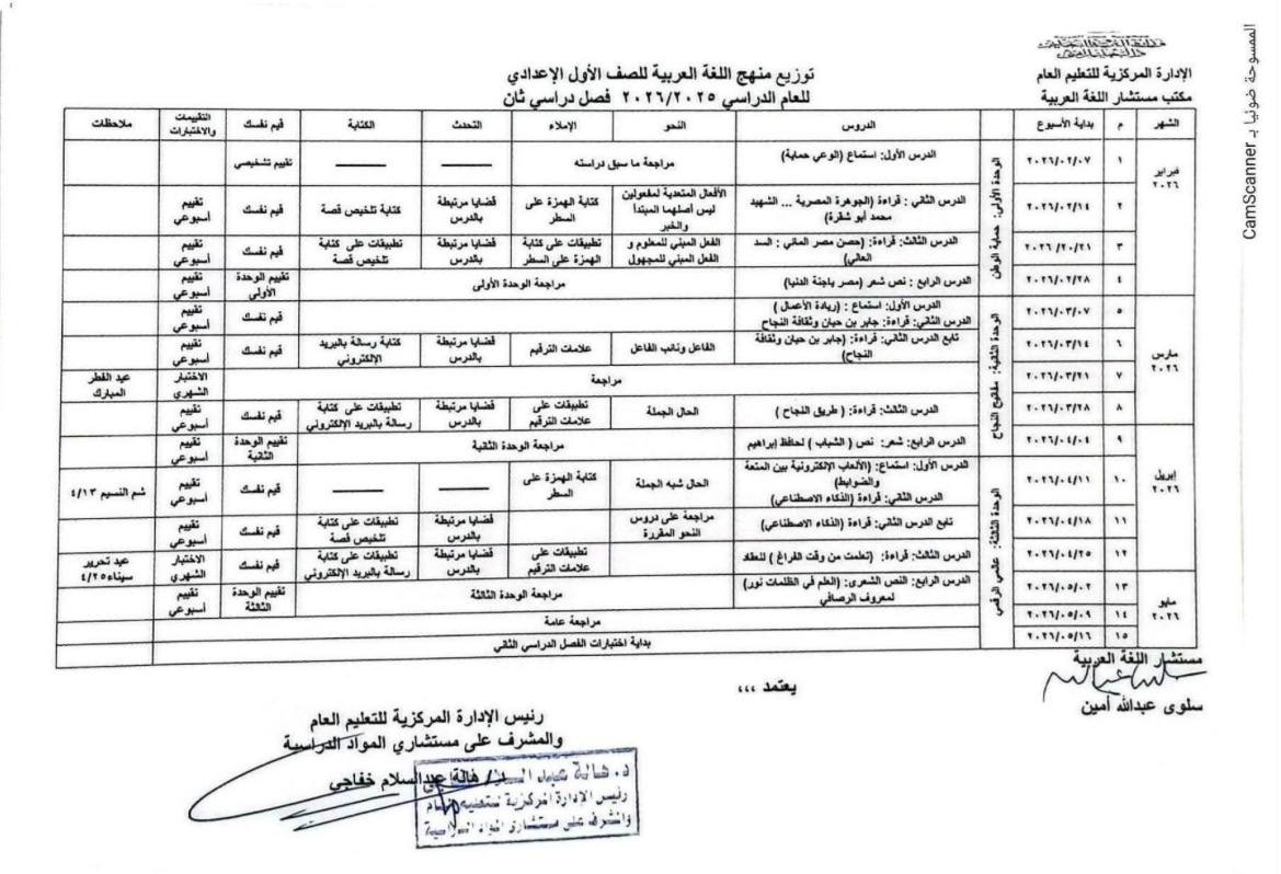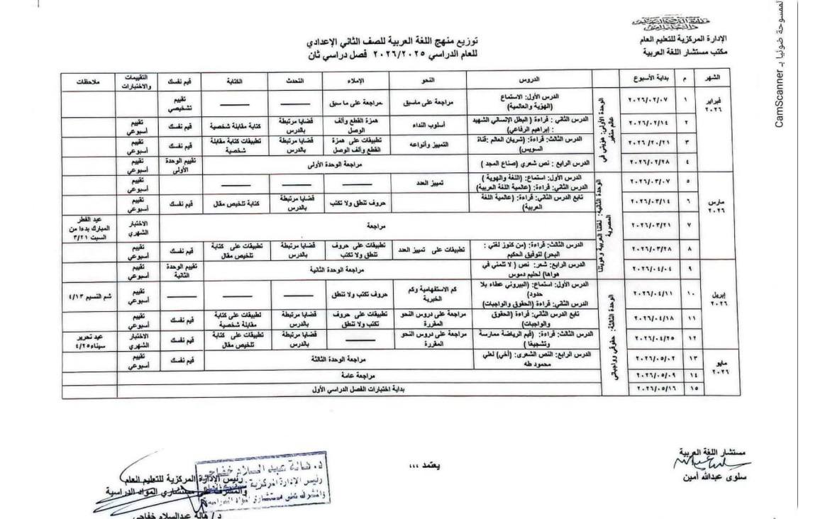 تعرف على توزيع منهج اللغة العربية للمرحلة الإعدادية 2026 pdf الترم الثاني