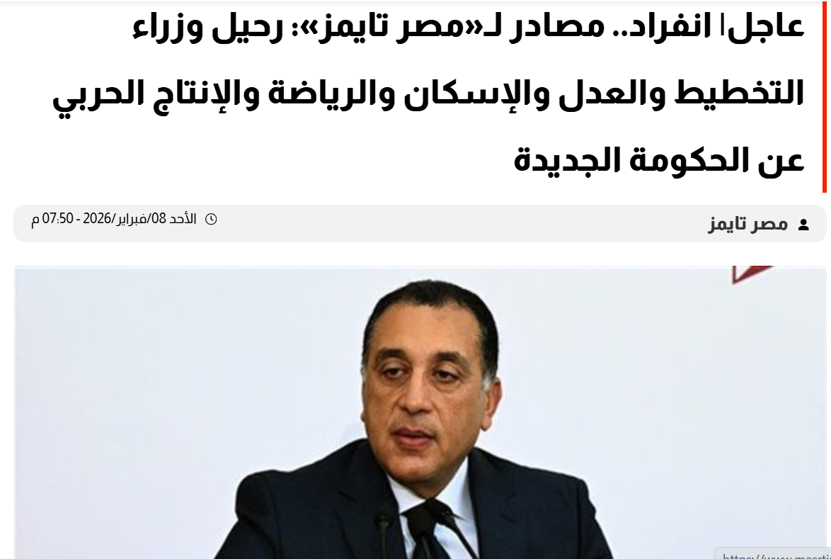 وكان «مصر تايمز» انفرد بتاريخ الأحد 8 فبراير الجارى، ونشر تقريرا عن خروج عدد من الوزراء بالتشكيل الجديد للحكومة ، بينهم الدكتورة رانيا المشاط، وزيرة التخطيط والتعاون الدولي، والدكتور أشرف صبحي، وزير الشباب والرياضة، والمهندس شريف الشربيني، وزير الإسكان، والمستشار عدنان فنجري، وزير العدل.