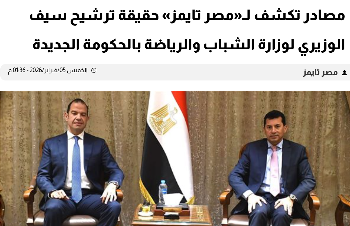 تأكيداً لما نشره «مصر تايمز» حول حقيقة ما تردد خلال الايام الماضية عن ترشيح اسم المهندس سيف الوزيري، رئيس مجلس إدارة شركة استادات للاستثمار الرياضي ونائب رئيس مجلس إدارة الشركة المتحدة للرياضة، لتولي حقيبة وزارة الشباب والرياضة خلفًا للدكتور أشرف صبحي، والتي أكدت أن هذا الأمر غير صحيح، وأن الاسم المتداول لم يكن ضمن المرشحين للحقيبة الوزارية، وأنه من المقترح أن يكون ضمن الوزراء الراحلين بالتغيير الوزاري المرتقب.