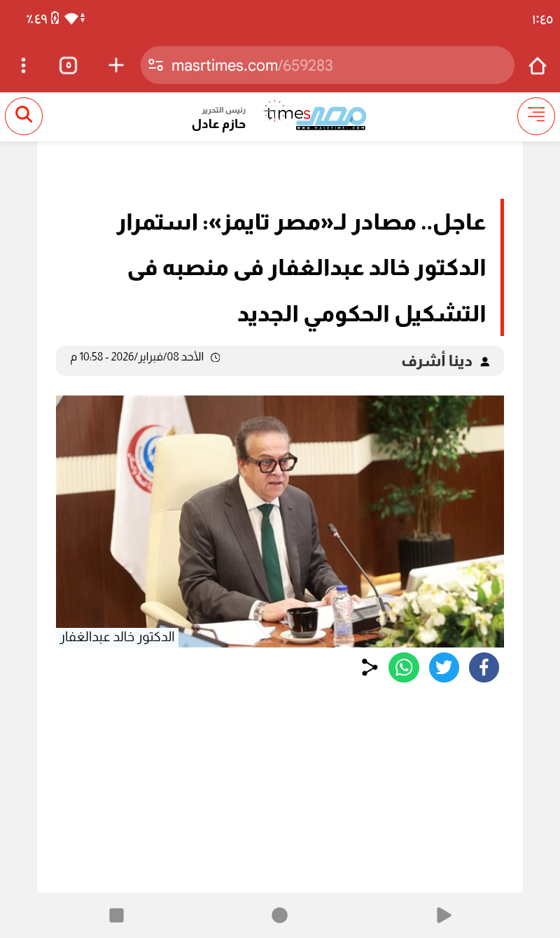تأكيد لـ«مصر تايمز»، باستمرار الدكتور خالد عبد الغفار، وزير الصحة والسكان، فى منصبه بالتشكيل الحكومي الجديد.