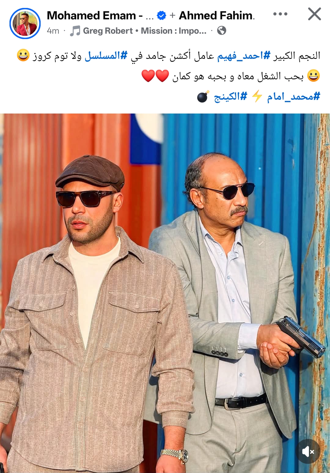 وجه الفنان محمد إمام رسالة لـ الفنان أحمد فهيم، وذلك بعد تعاونهما في مسلسل الكينج، الذي من المقرر عرضه في رمضان 2026.