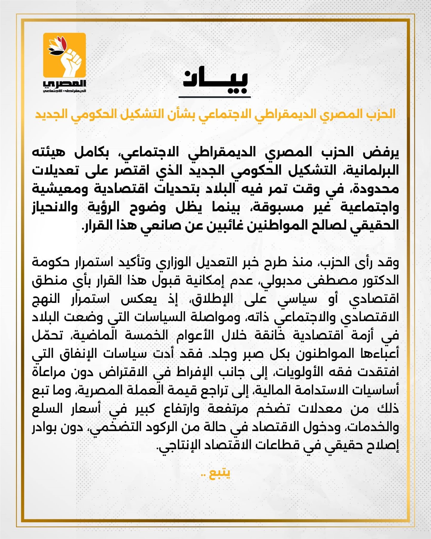 وبناءً على كل ما تقدم، يؤكد الحزب المصري الديمقراطي الاجتماعي أن رفضه للتشكيل الحكومي الجديد لا يأتي من منطلق المعارضة من أجل المعارضة، بل انطلاقًا من الحرص على مصلحة الوطن والمواطن، والدعوة إلى تبني مسار إصلاح حقيقي يعيد بناء الثقة بين الدولة والمجتمع، ويضع العدالة الاجتماعية في صدارة الأولويات.