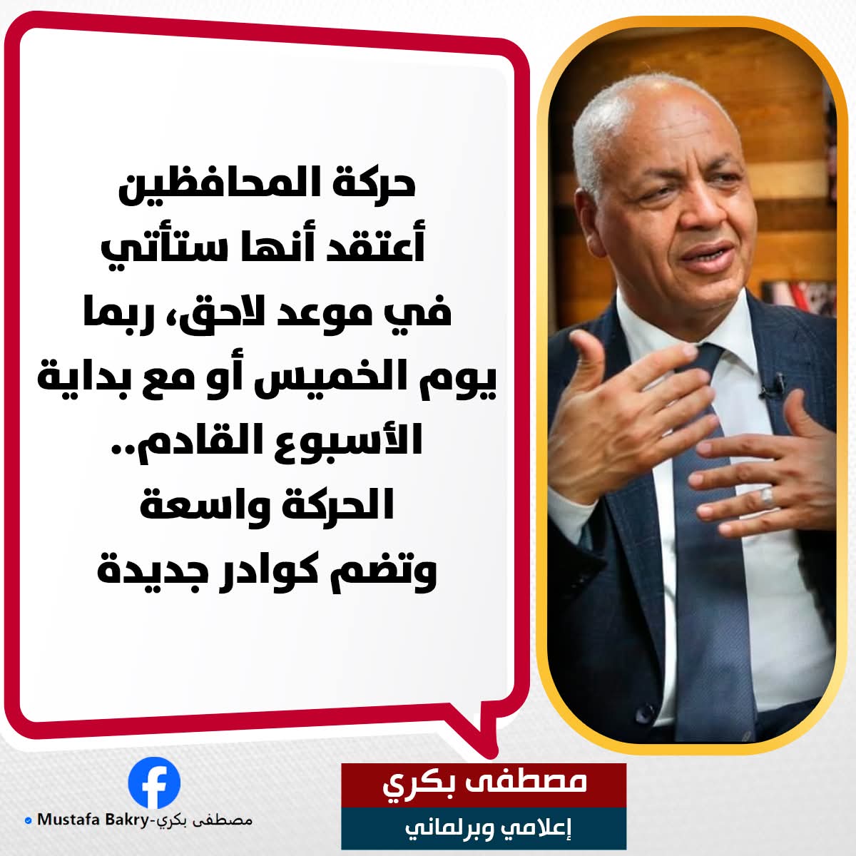 وكتب بكري، عبر صفحته الرسمية على موقع التواصل الاجتماعي «فيس بوك»، أن التوقعات تشير إلى قرب صدور الحركة، في إطار توجه لتجديد الدماء وتعزيز الأداء التنفيذي بالمحافظات.