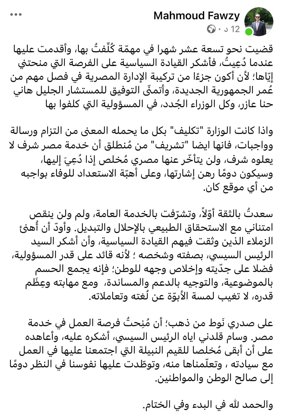 وجاء في نص رسالة المستشار محمود فوزي: «قضيت نحو تسعة عشر شهرا في مهمّة كُلِّفتُ بها، وأقدمت عليها عندما دُعِيتُ، فأشكر القيادة السياسية على الفرصة التي منحتني إيّاها؛ لأن أكون جزءًا من تركيبة الإدارة المصرية في فصل مهم من عُمر الجمهورية الجديدة، وأتمنّى التوفيق للمستشار الجليل هاني حنا عازر، وكل الوزراء الجُدد، في المسؤولية التي كلفوا بها