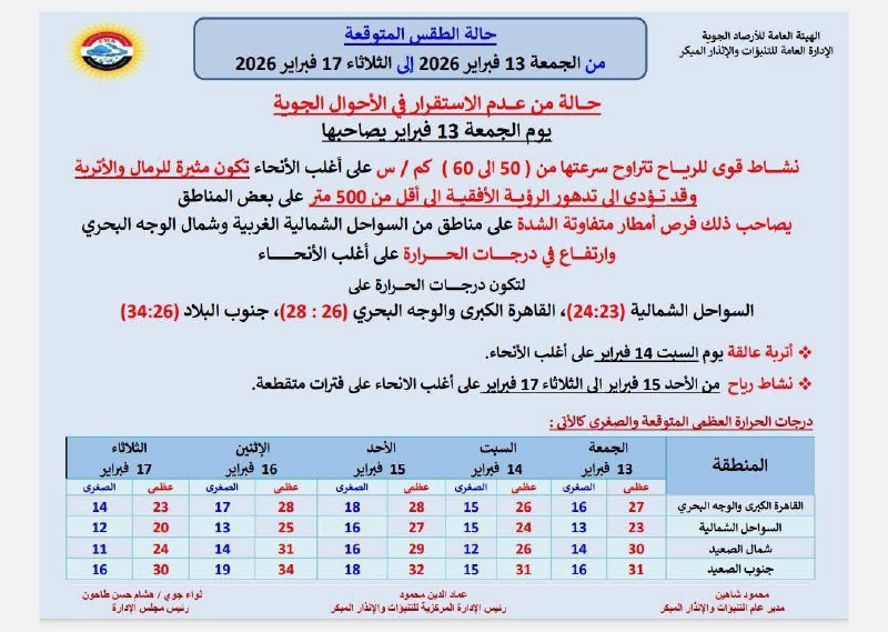 حالة الطقس غدًا الجمعة 13 فبراير 2026.. تشهد حالة الطقس في مصر غدًا الجمعة 13 فبراير 2026 حالة من عدم الاستقرار في الأحوال الجوية، وفق ما أعلنته الإدارة العامة للتنبؤات والإنذار المبكر بهيئة الأرصاد الجوية والتي أوضحت أن البلاد تتأثر بنشاط قوي للرياح وفرص لسقوط الأمطار على عدد من المناطق مع ارتفاع ملحوظ في درجات الحرارة على أغلب الأنحاء.