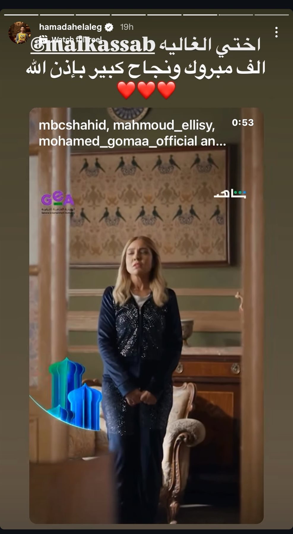 وكتب حمادة هلال من خلال حسابه الرسمي عبر موقع تبادل الصور والفيديوهات القصيرة إنستجرام، عبر خاصية ستوري: اختي الغالية ألف مبروك ونجاح كبير بإذن الله.