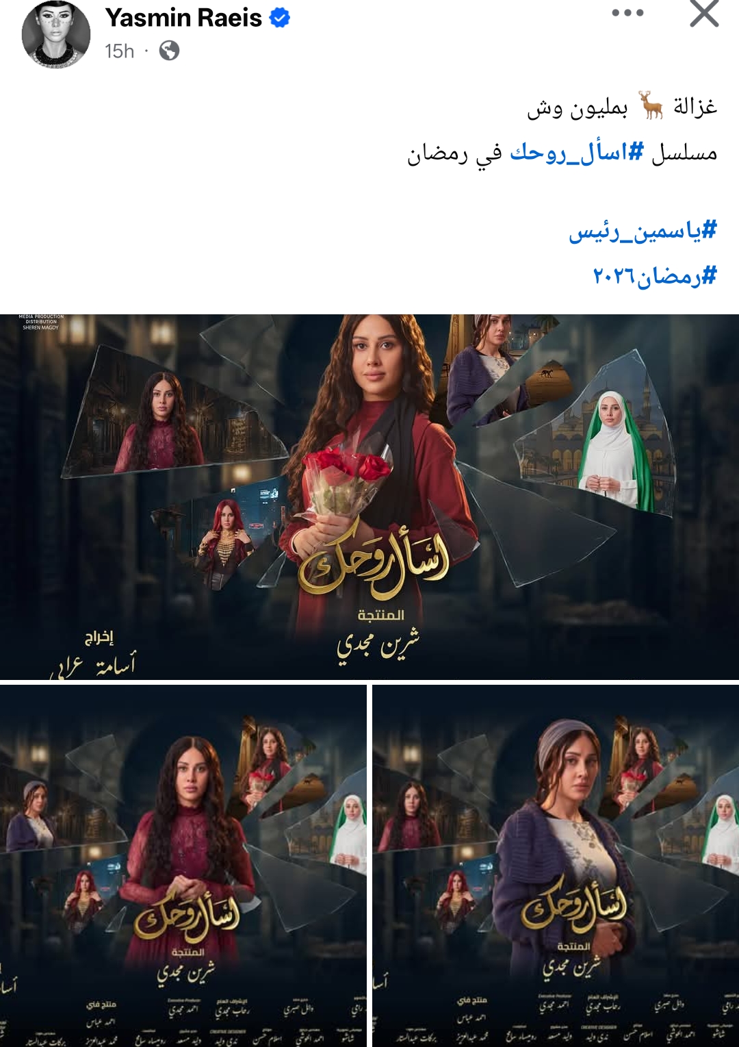 ونشرت ياسمين رئيس بوسترات مسلسلها اسأل روحك، وكتبت من خلال حسابها الرسمي عبر موقع التواصل الاجتماعي فيسبوك، قالت: غزالة بمليون وش.. مسلسل اسأل روحك في رمضان.
