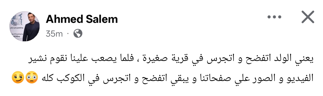 وكتب أحمد سالم من خلال حسابه الرسمي عبر موقع التواصل الاجتماعي فيسبوك، قال: يعني الولد اتفضح واتجرس في قرية صغيرة، فلما يصعب علينا نقوم نشير الفيديو والصور على صفحاتنا ويبقة اتفضح واتجرس في الكوكب كله.