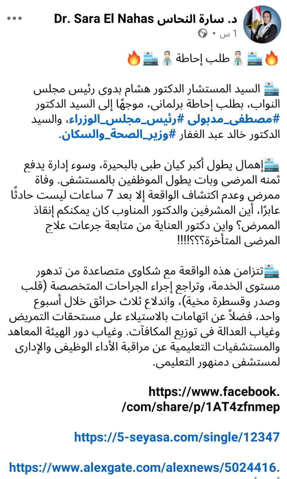 تقدمت الدكتورة سارة النحاس، عضو مجلس النواب بطلب إحاطة عاجل موجه إلى الدكتور مصطفى مدبولي رئيس مجلس الوزراء والدكتور خالد عبدالغفار وزير الصحة والسكان بشأن واقعة وفاة ممرض داخل مستشفى دمنهور التعليمي بمحافظة البحيرة.
