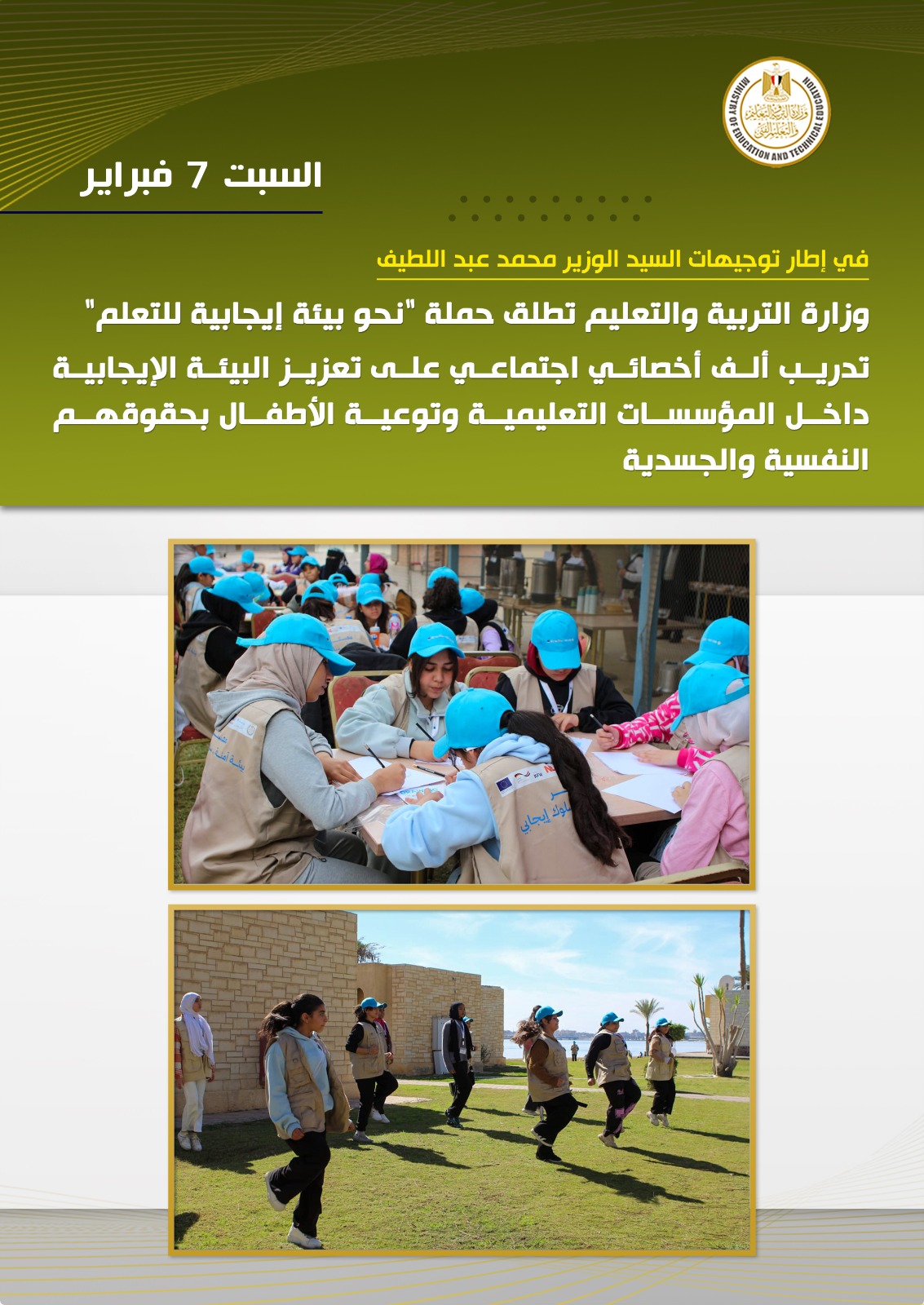 في إطار توجيهات السيد محمد عبد اللطيف وزير التربية والتعليم والتعليم الفني، أطلقت وزارة التربية والتعليم والتعليم الفني مع بداية الفصل الدراسي الثاني حملة توعوية بعنوان "نحو بيئة إيجابية للتعلم" بهدف دعم المناخ النفسي والاجتماعي داخل المدارس، وذلك بالتعاون مع منظمة اليونيسف.