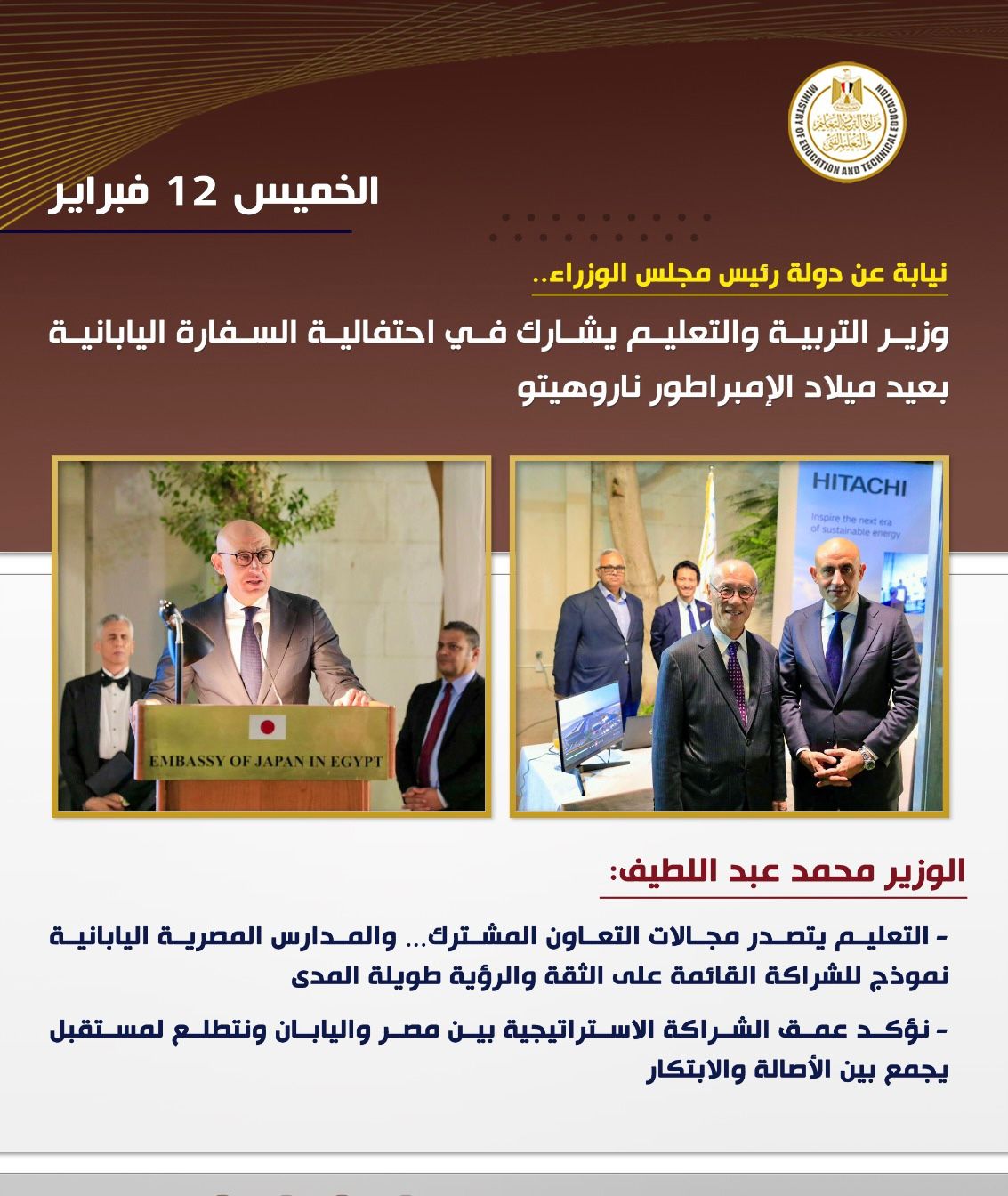 في إطار العلاقات المتميزة التي تربط بين جمهورية مصر العربية واليابان، شارك نيابةً عن دولة رئيس مجلس الوزراء السيد الدكتور مصطفى مدبولي، السيد/ محمد عبد اللطيف وزير التربية والتعليم والتعليم الفني، في الحفل الذي أقامته السفارة اليابانية بالقاهرة بمناسبة الاحتفال بعيد ميلاد جلالة إمبراطور اليابان ناروهيتو.