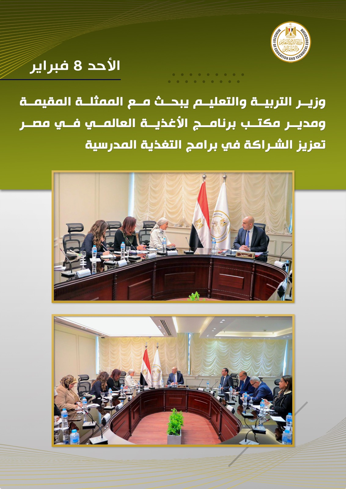 ومن جانبها، أعربت الممثلة المقيمة ومدير مكتب برنامج الأغذية العالمي في مصر عن تقديرها للتعاون الوثيق مع وزارة التربية والتعليم والتعليم الفني، مثمنةً الجهود التي تبذلها الوزارة في تطوير منظومة التعليم، ومؤكدة أهمية الشراكة مع الوزارة وتبادل الخبرات في هذا المجال بما يحقق الأهداف المشتركة.
