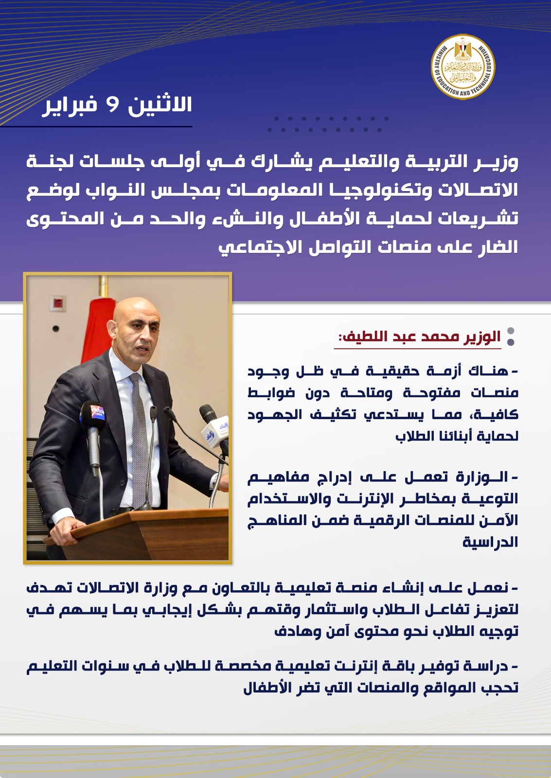 شارك محمد عبد اللطيف وزير التربية والتعليم والتعليم الفنى، فى جلسة استماع بلجنة الاتصالات وتكنولوجيا المعلومات بمجلس النواب، برئاسة الدكتور النائب أحمد بدوي؛ وذلك لعرض رؤية وزارة التربية والتعليم فيما يتعلق بدراسة وضع تشريعات تسهم في حماية الأطفال والنشء والحد من المحتوى الضار على منصات التواصل الاجتماعي، وذلك تنفيذا للتوجيهات الرئاسية.